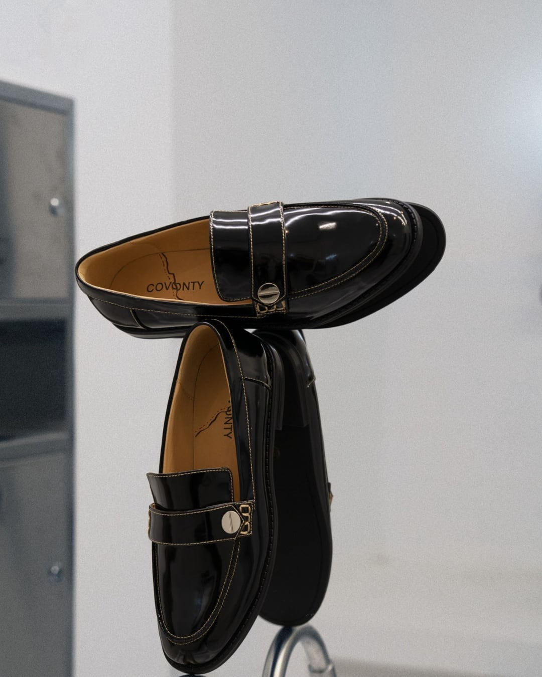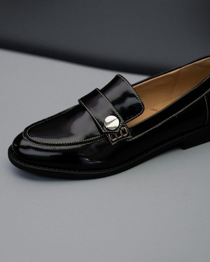 クラシックなローファーに光沢レザーとメタルパーツを組み合わせた、上品で洗練された一足。艶やかなアッパーが足元を華やかに引き立て、普段使いからきちんとシーンまで幅広く対応。しっかりとしたフラットソールと低めヒールで、快適な履き心地も魅力です。