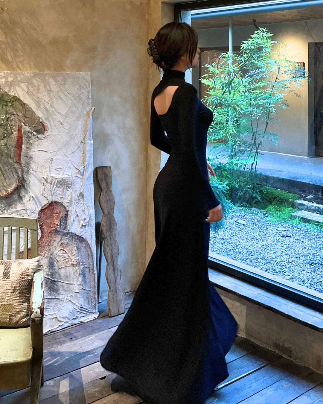 #カットアウト #ハイネック #ロングワンピ #ボディライン強調 #ブラックコーデ #秋冬スタイル