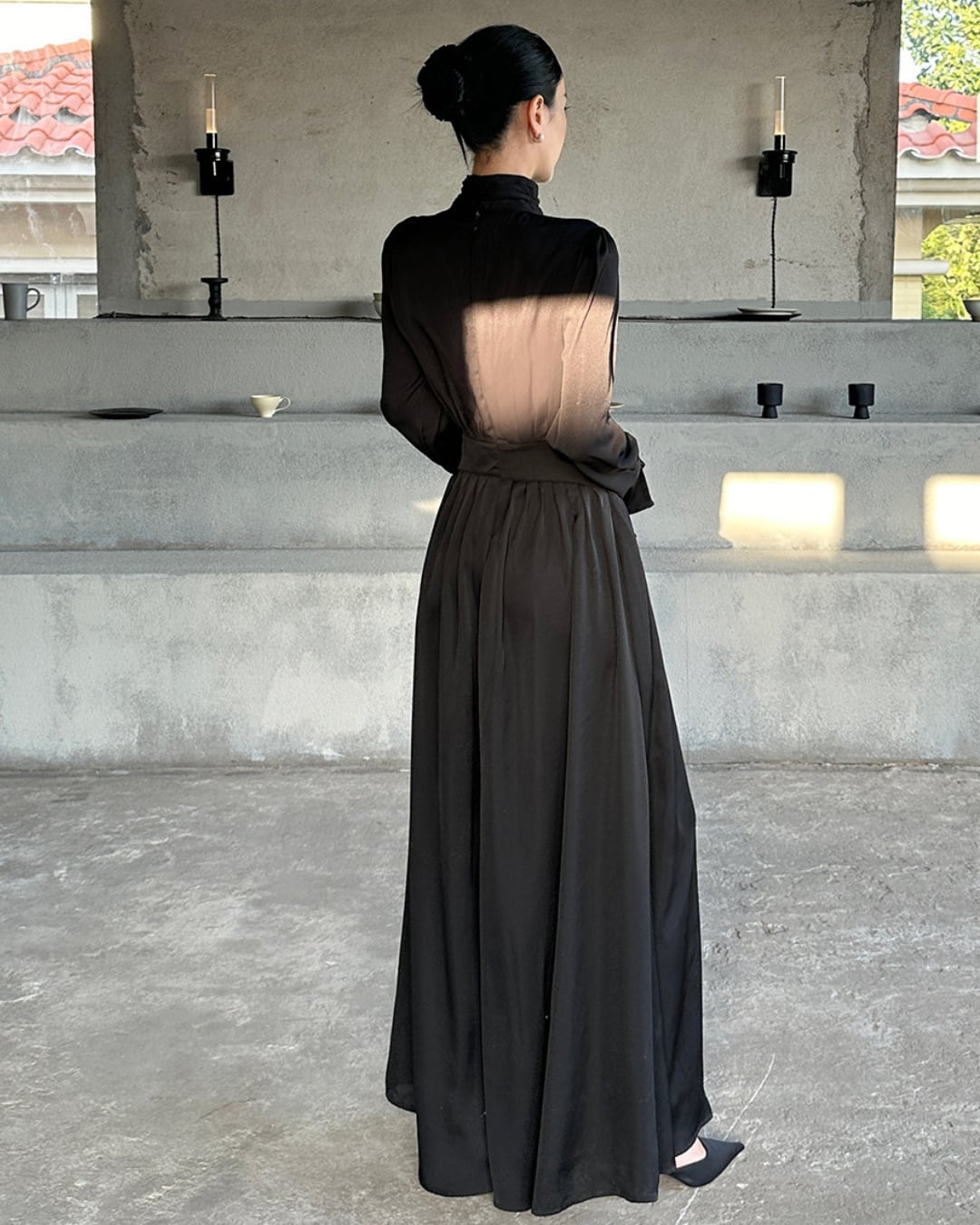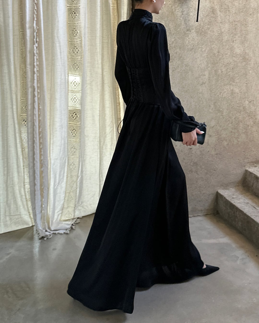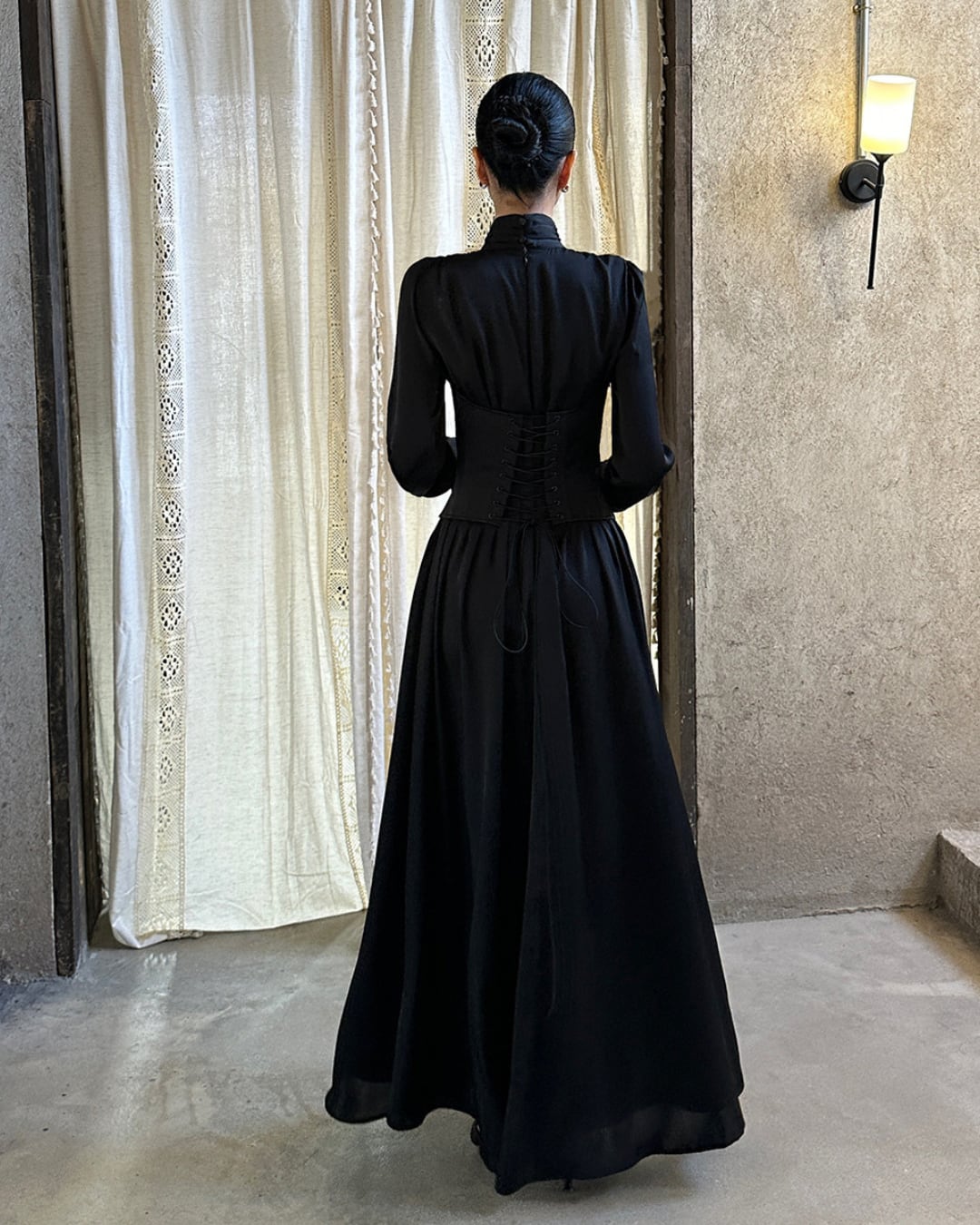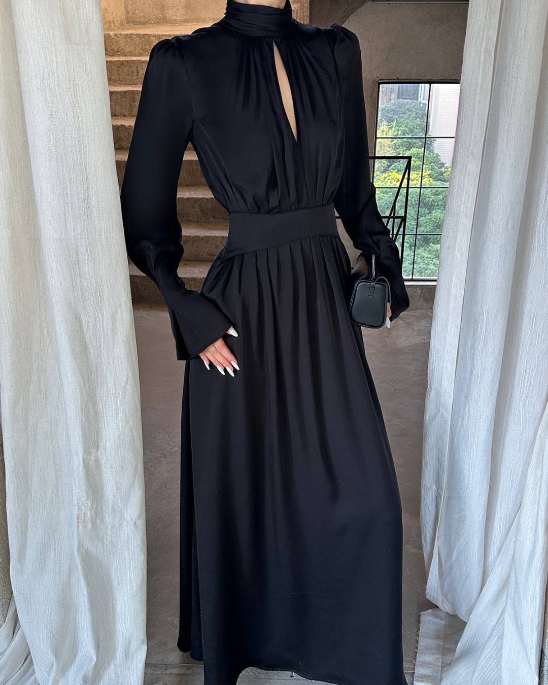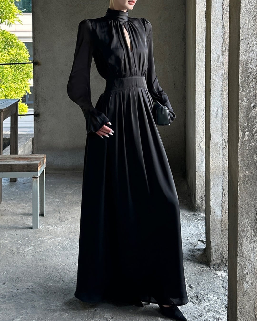 ヴィンテージライクな立ち襟と繊細なキーネックが特徴の、クラシックなAラインロングワンピース。上品なプリーツと美しいフレアシルエットが気品を引き立てます。背面は隠しファスナー仕様で、光沢のある共布ボタンが後ろ姿にも華を添えます。フォーマルからパーティーシーンにも活躍する1着です。
