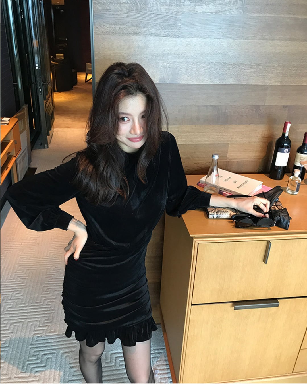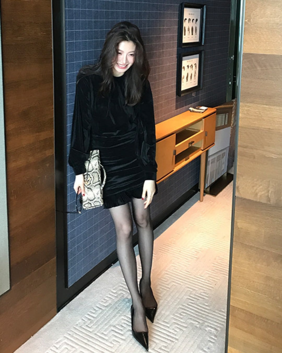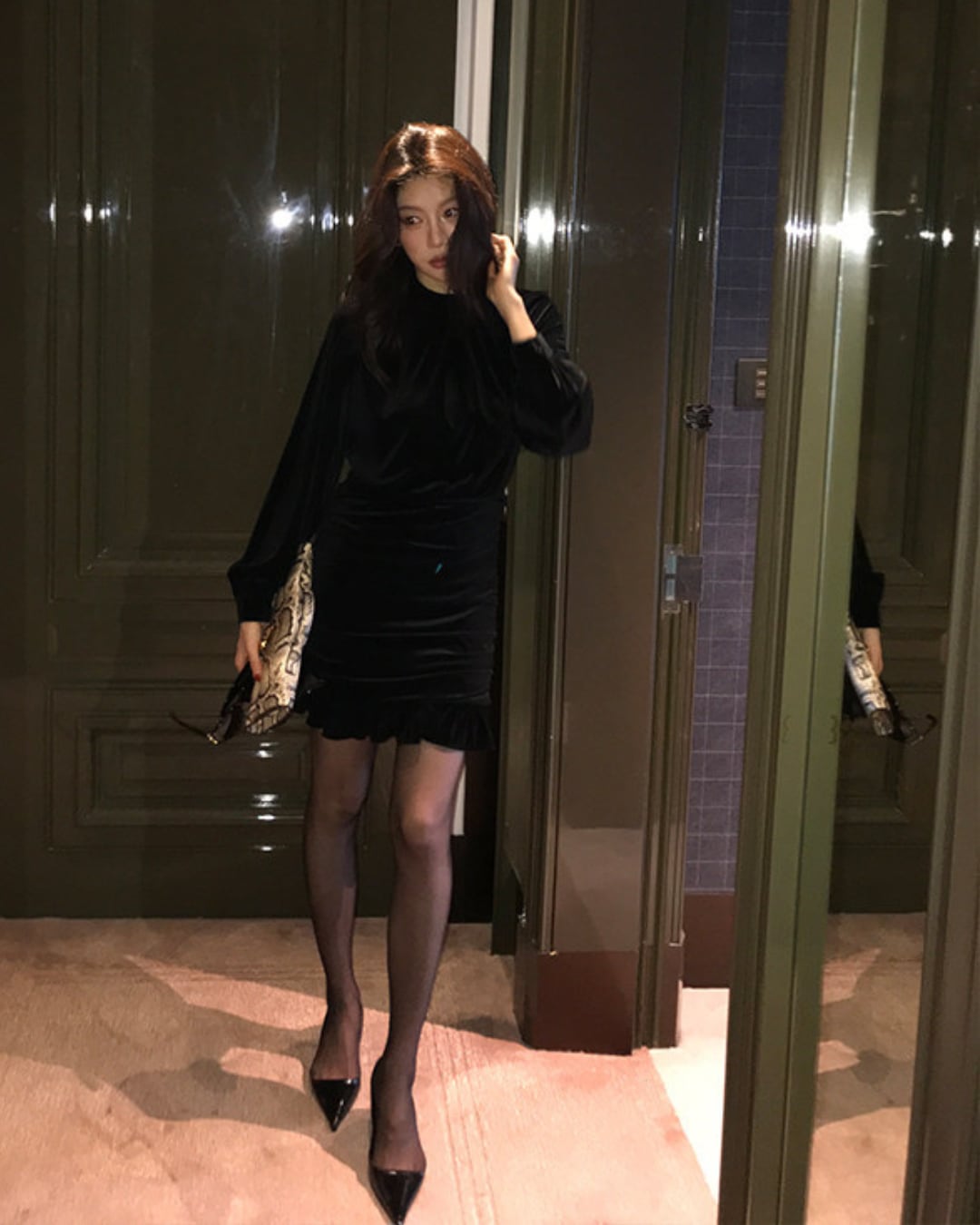 #ベロアワンピース #ドレープデザイン #タイトシルエット #ミニドレス #ブラックコーデ #華やかスタイル