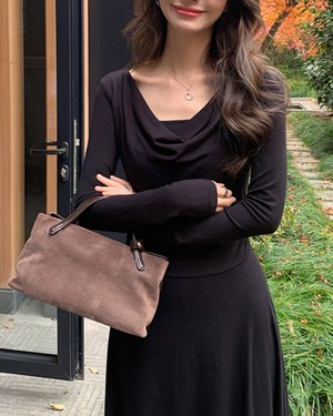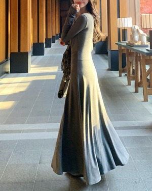 上品なフィット&フレアシルエットが魅力のロングワンピース。程よい伸縮性で体にやさしくフィットし、柔らかな素材感が快適な着心地を実現。一枚で着映えするシンプルエレガントな一着です。