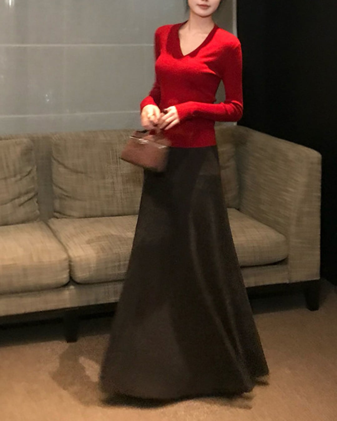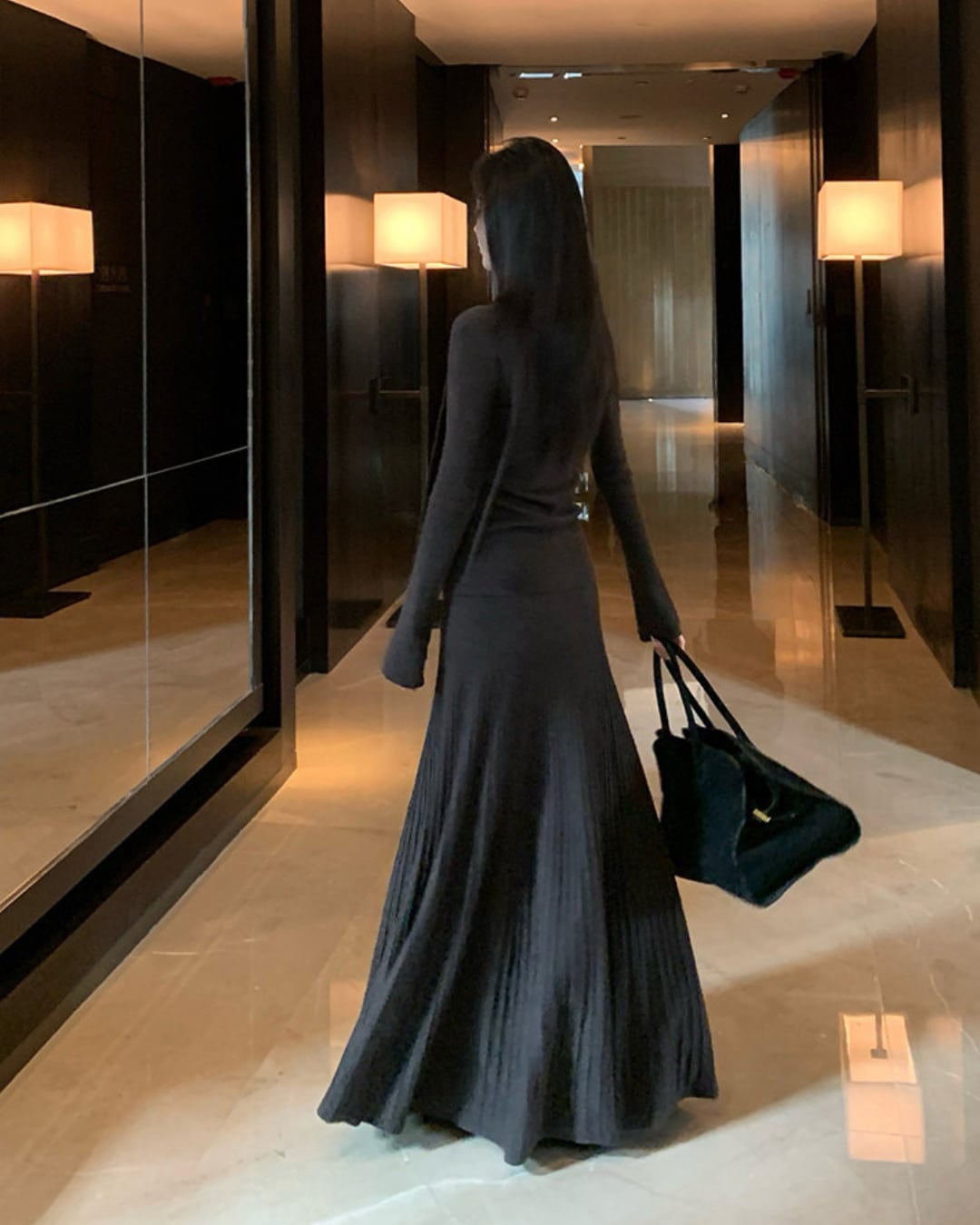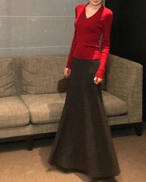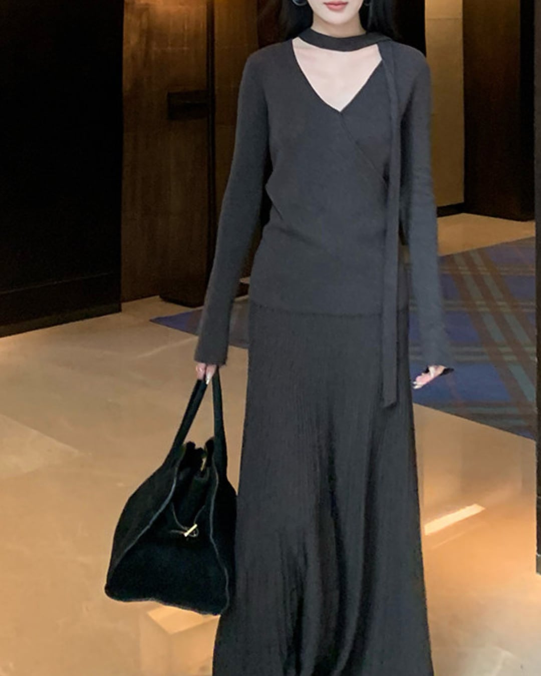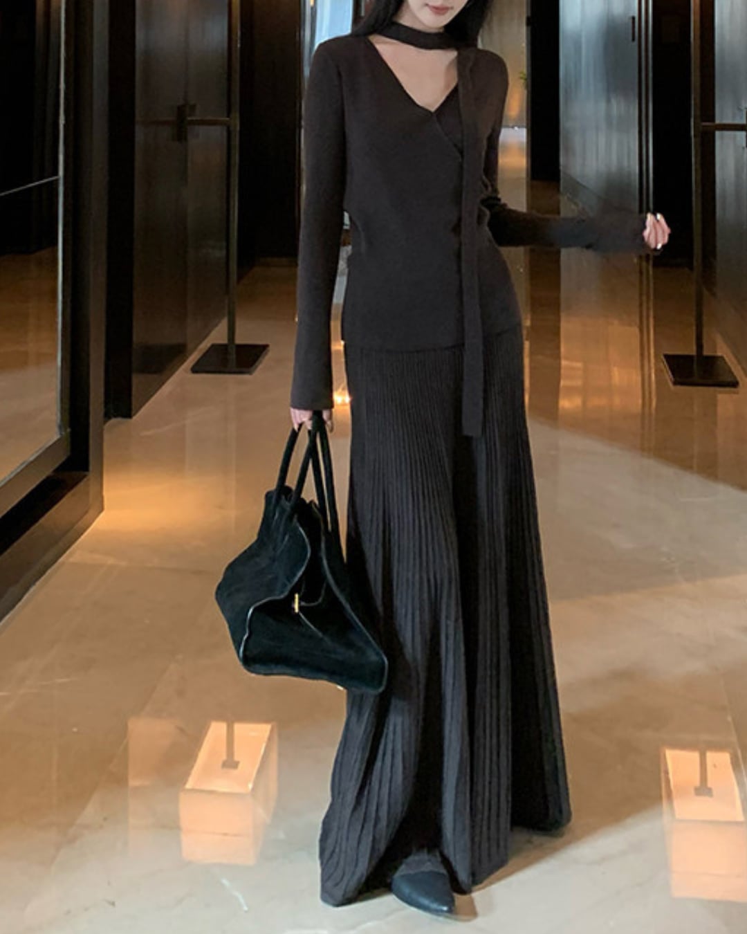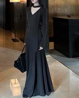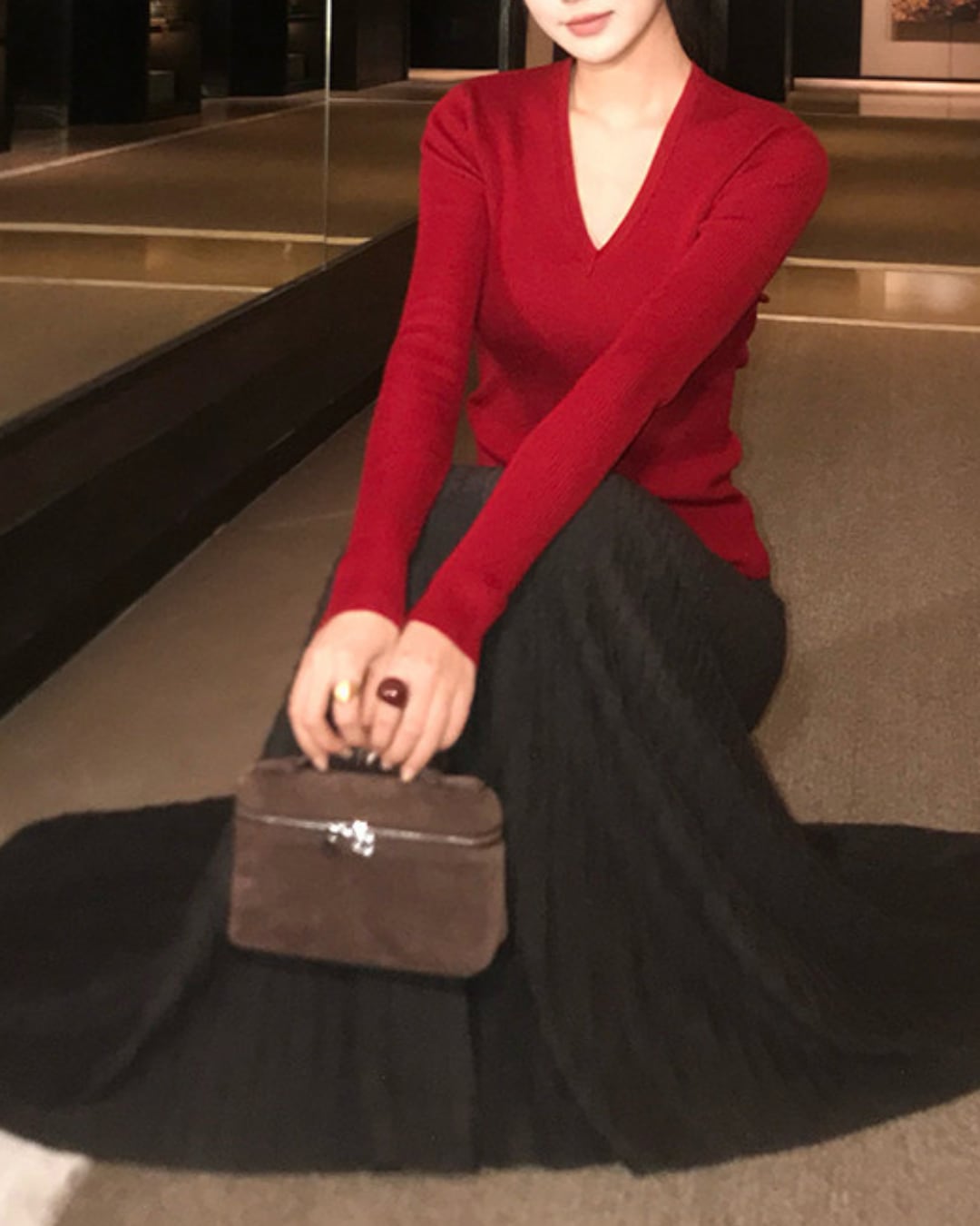 上品なVネックトップスとプリーツ風ロングスカートのニットセットアップ。ミニマルながらも洗練されたシルエットで、着るだけで大人のこなれ感を演出。上下別々でも着回しでき、着こなしの幅が広がります。
