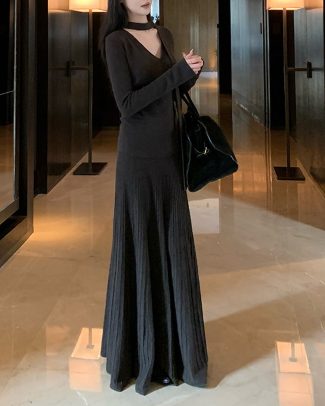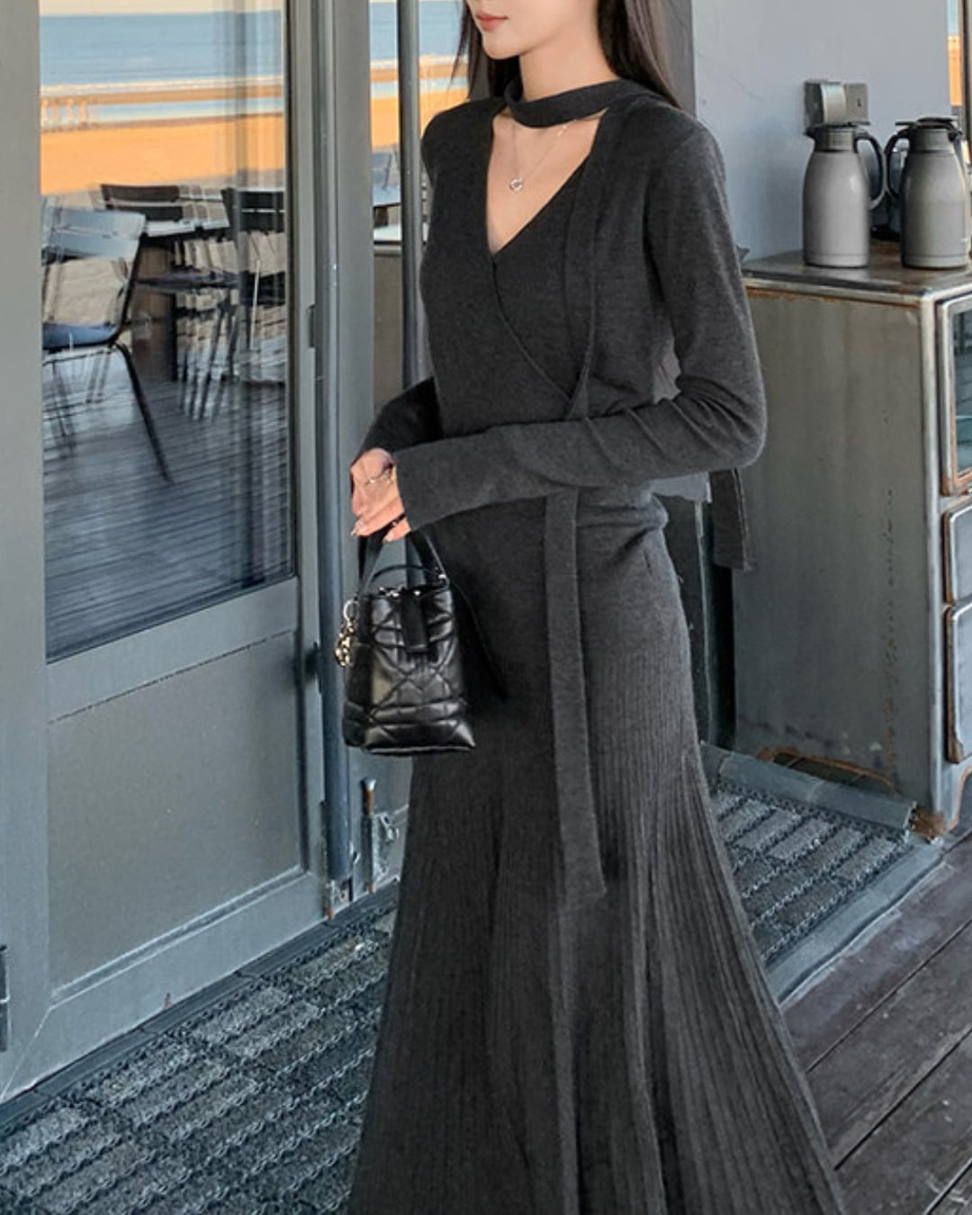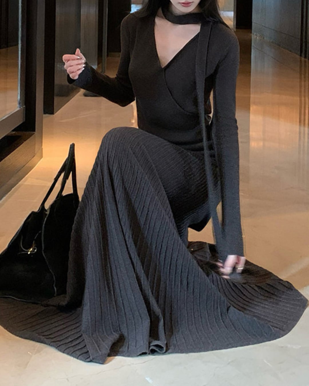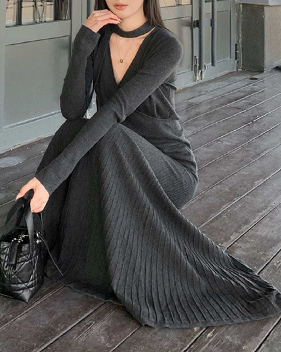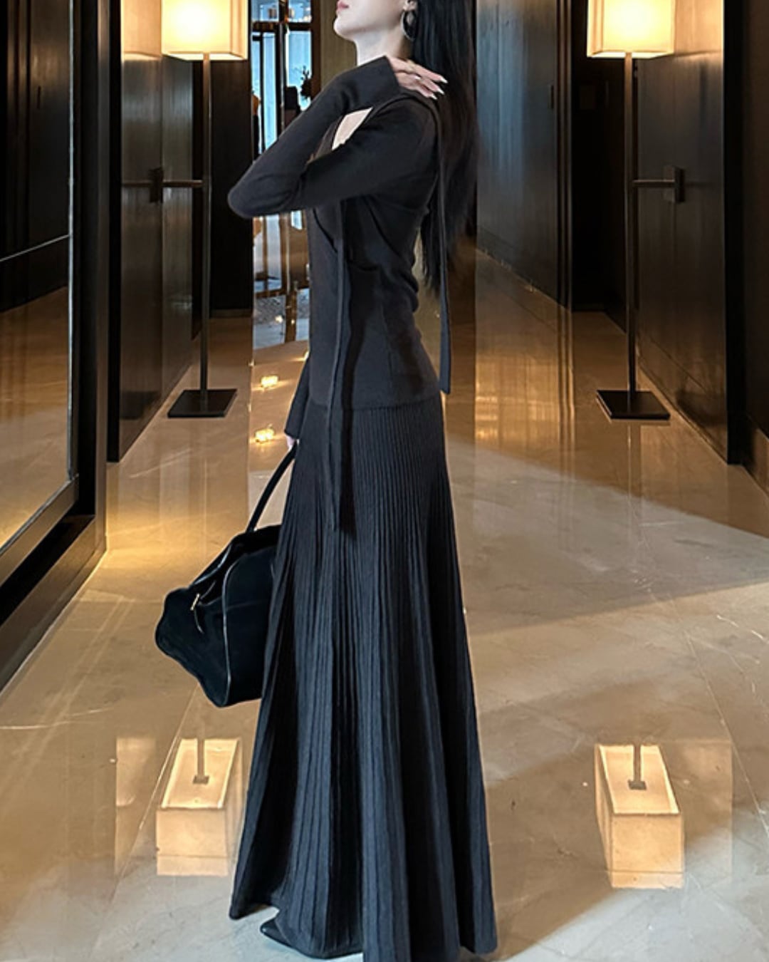 上品なVネックトップスとプリーツ風ロングスカートのニットセットアップ。ミニマルながらも洗練されたシルエットで、着るだけで大人のこなれ感を演出。上下別々でも着回しでき、着こなしの幅が広がります。