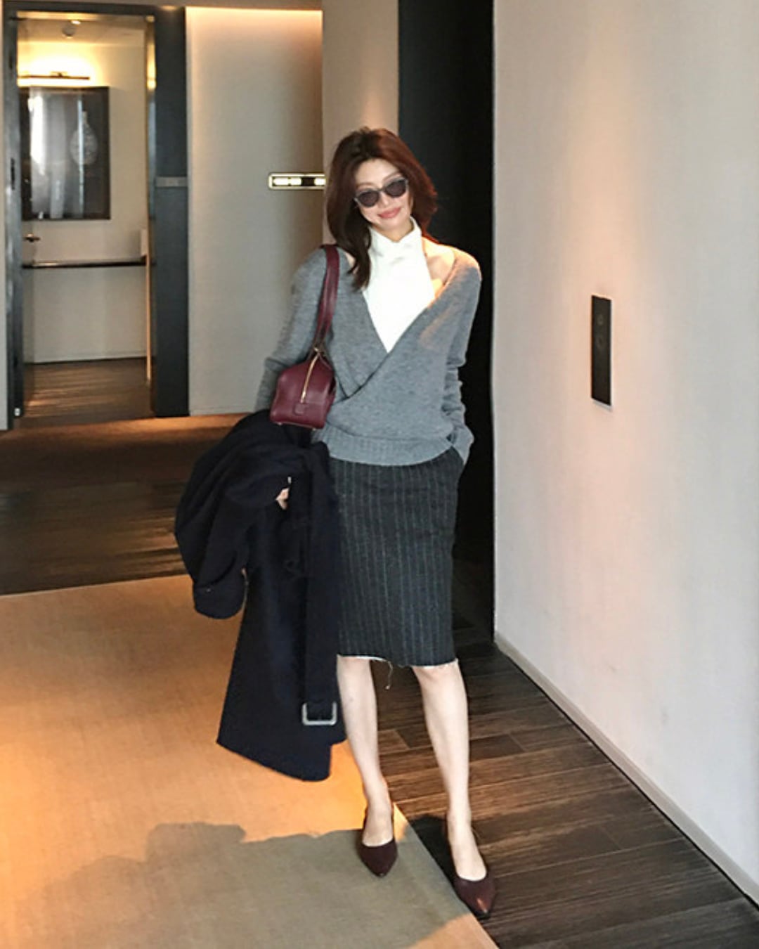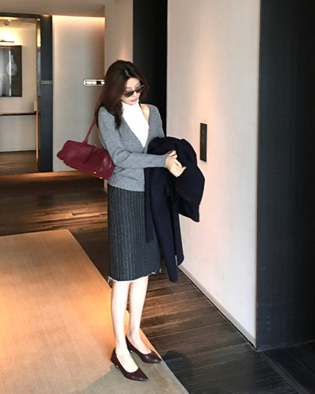 #クロスデザイン #レイヤード風 #Vネック #抜け感ニット #大人カジュアル #フェミニンコーデ