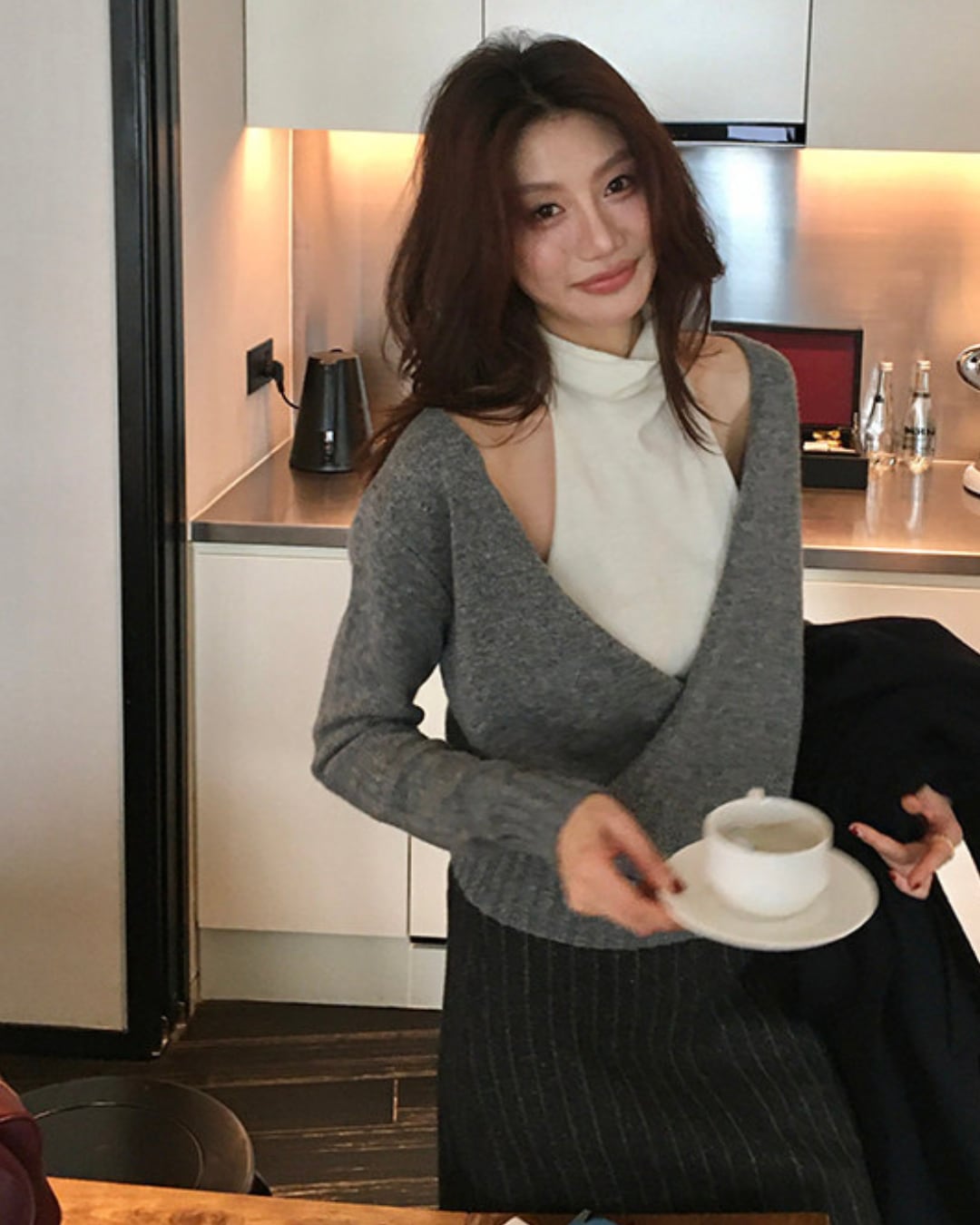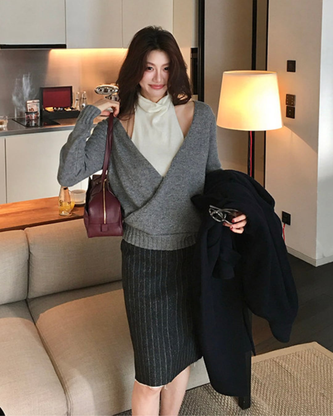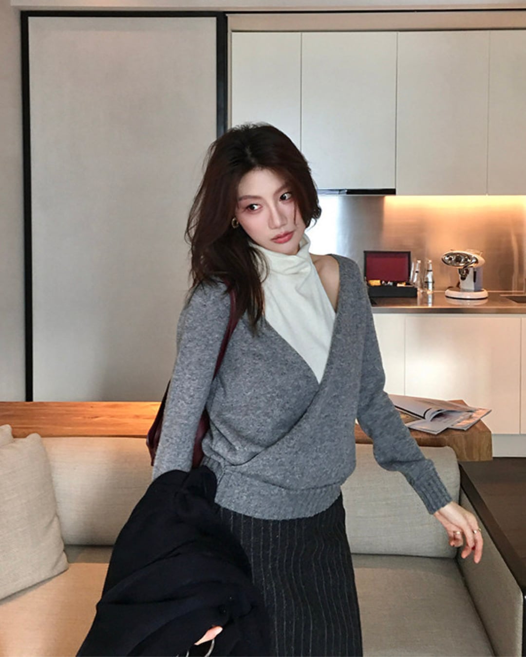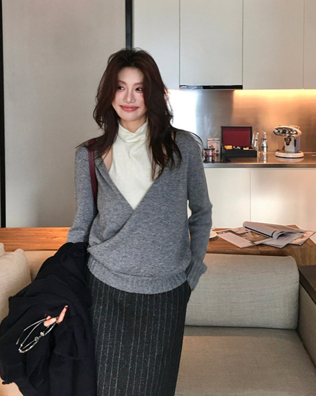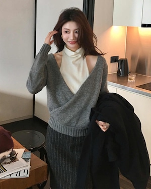 レイヤード風のクロスデザインが目を惹く、フェミニンなVネックニット。程よい抜け感を演出するバックオープン仕様と、柔らかく暖かな風合いが魅力。一枚で主役になる、洗練された冬の大人スタイルにぴったりの一着です。