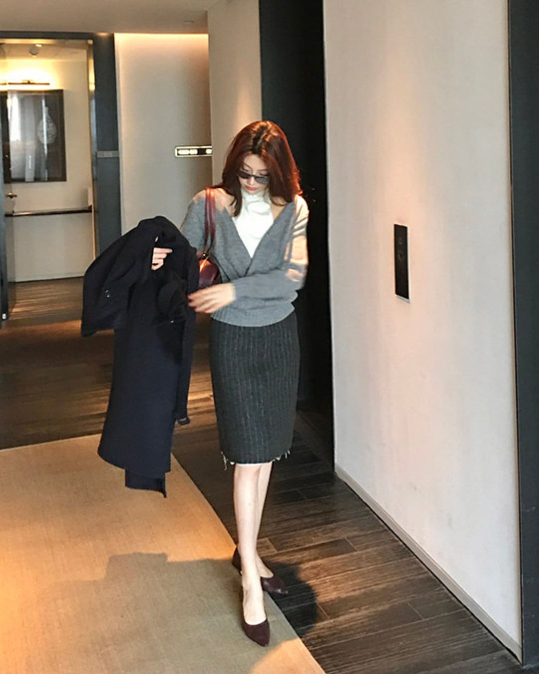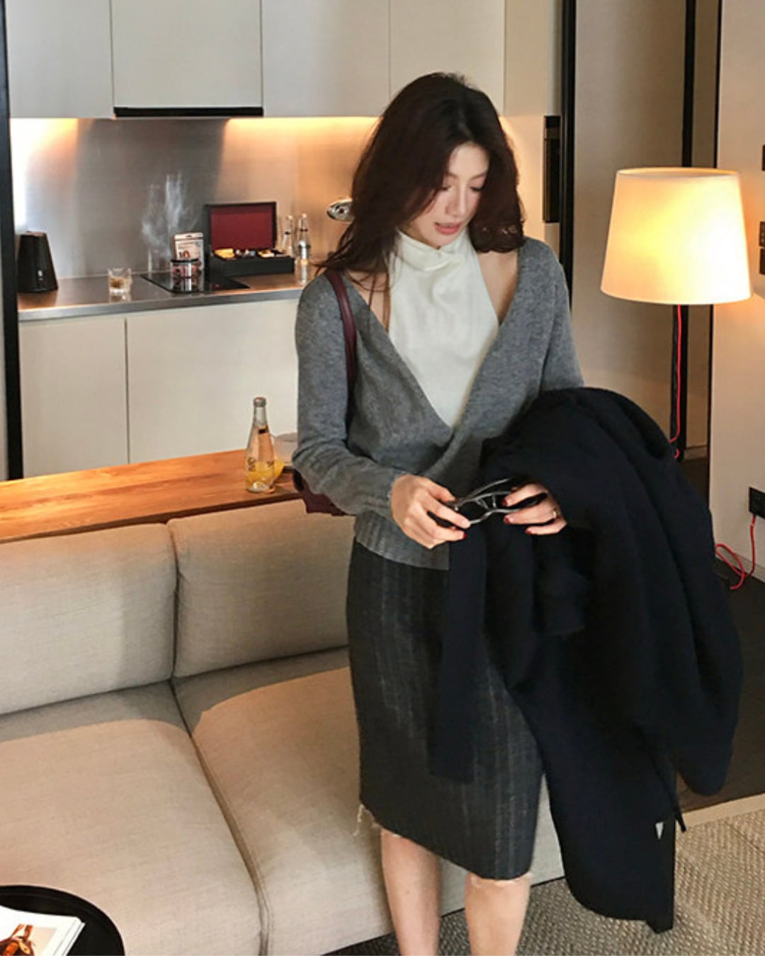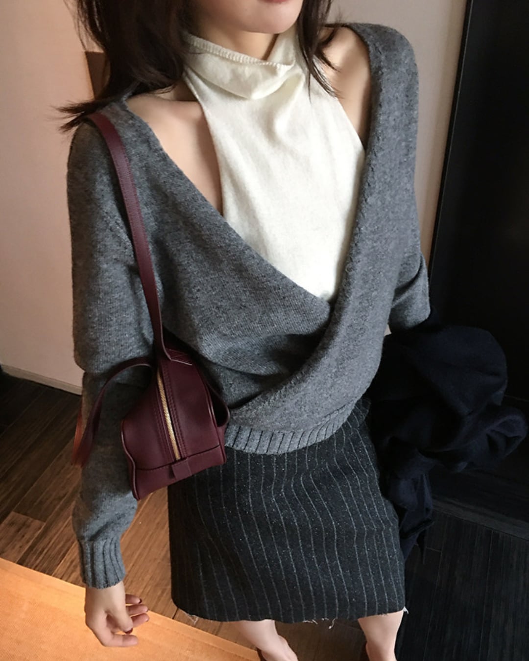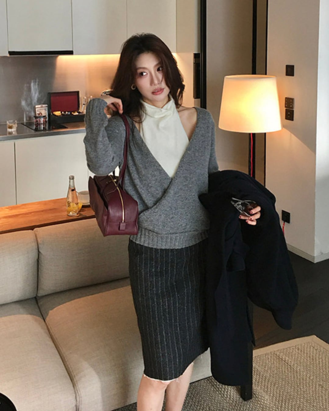 レイヤード風のクロスデザインが目を惹く、フェミニンなVネックニット。程よい抜け感を演出するバックオープン仕様と、柔らかく暖かな風合いが魅力。一枚で主役になる、洗練された冬の大人スタイルにぴったりの一着です。