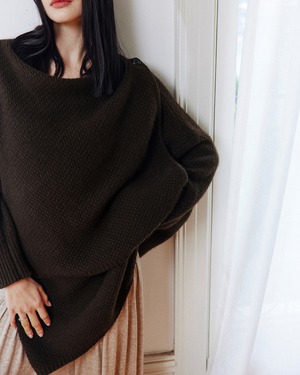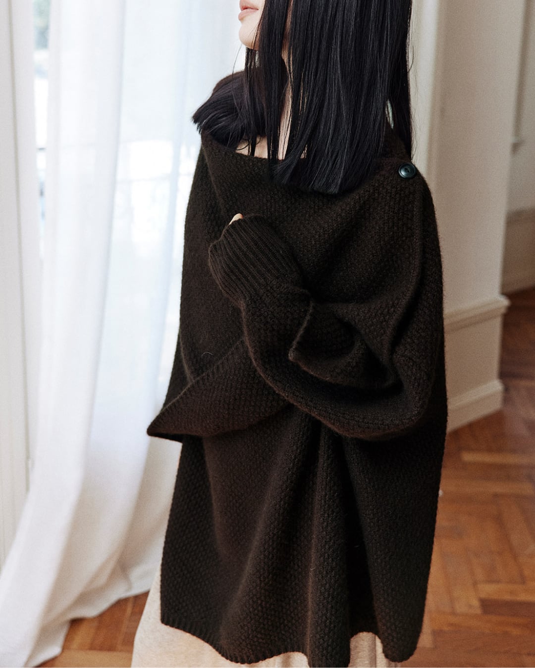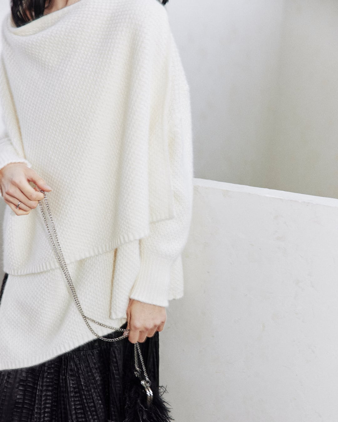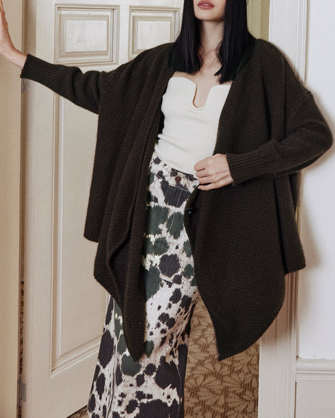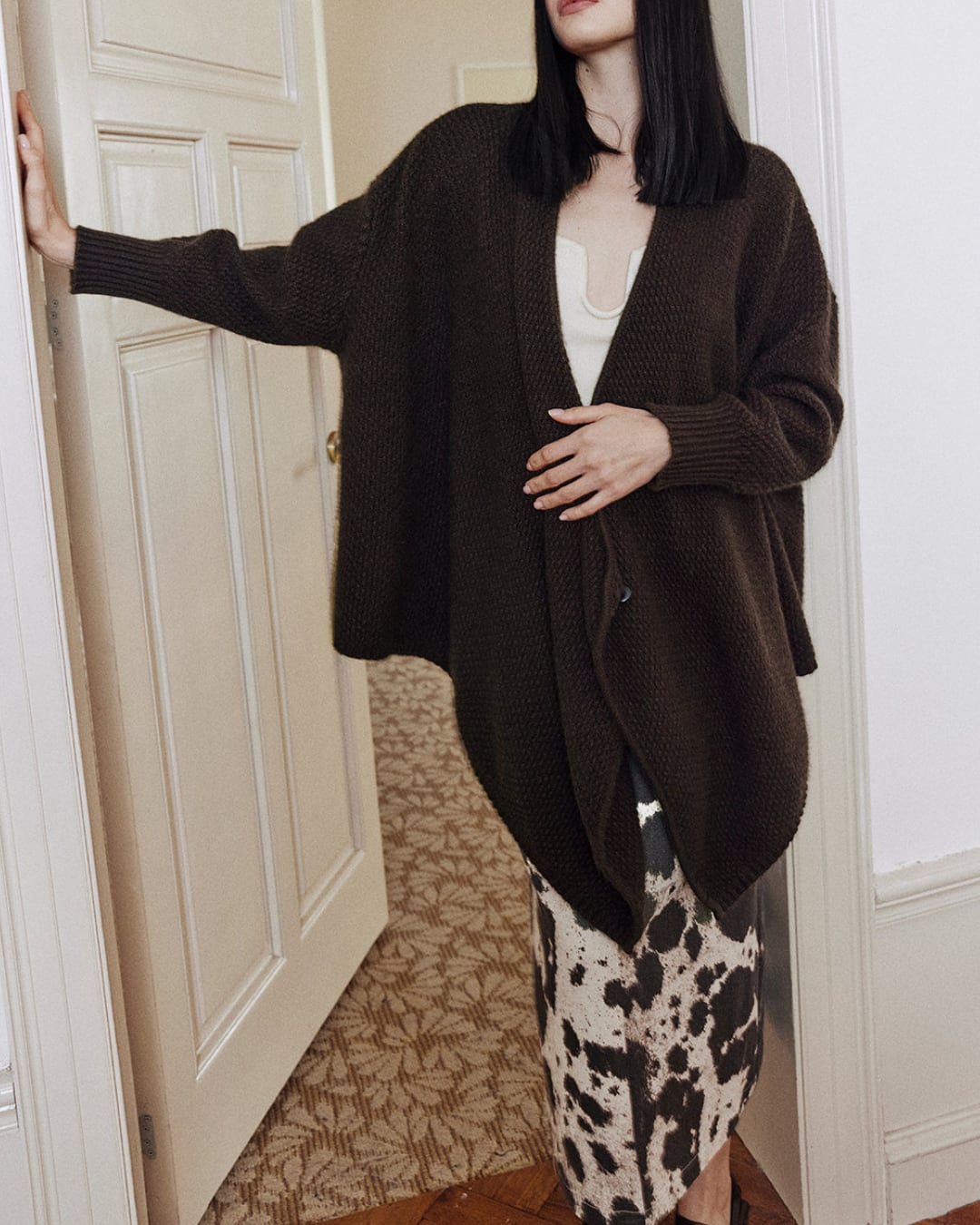 前後2WAYで着られるゆるシルエットのドレープカーディガン。ボタンの留め方によってシルエットが変化し、スタイリングの幅が広がります。しっかりと厚みのあるニットで防寒性も◎