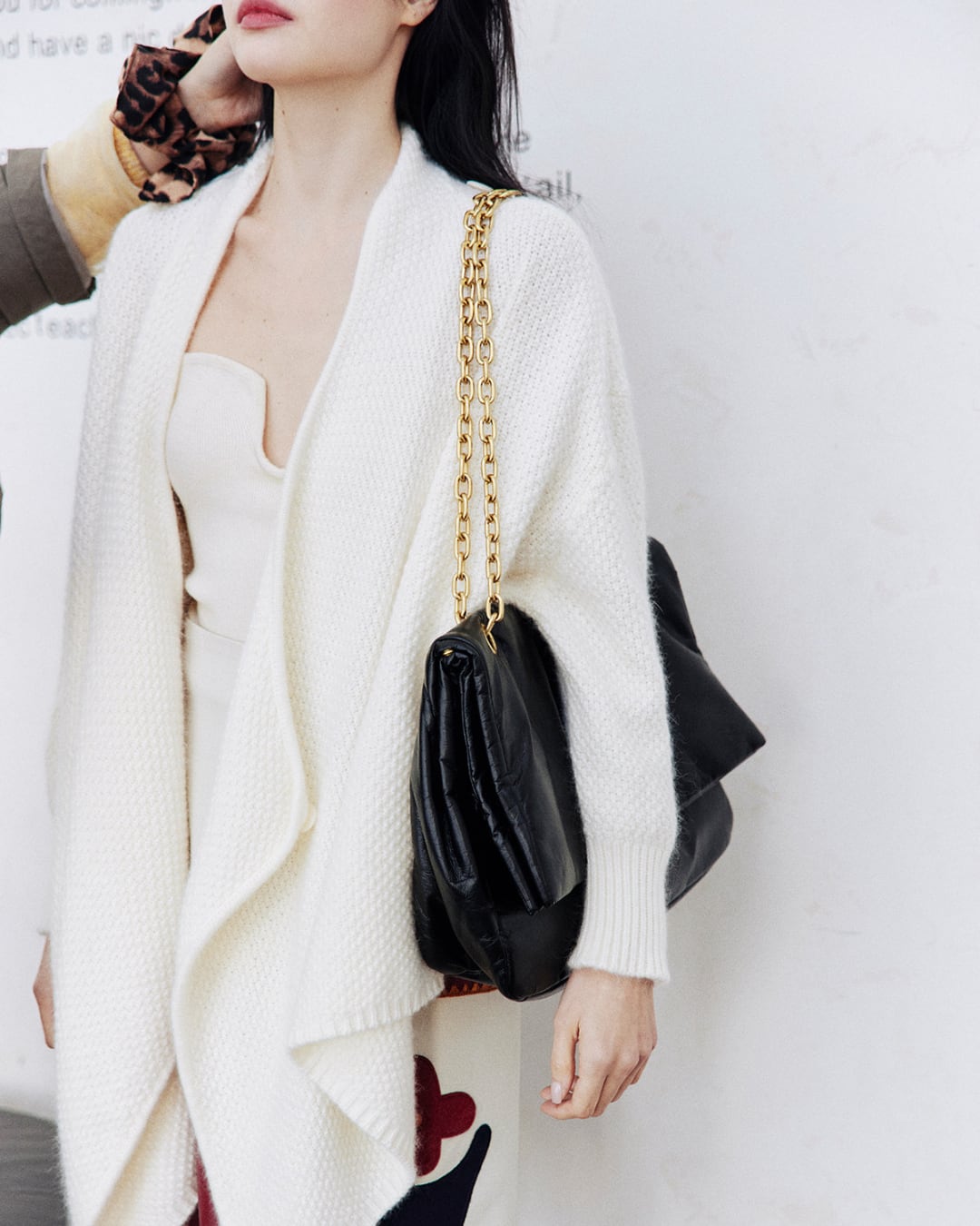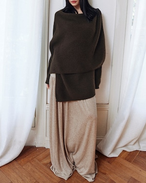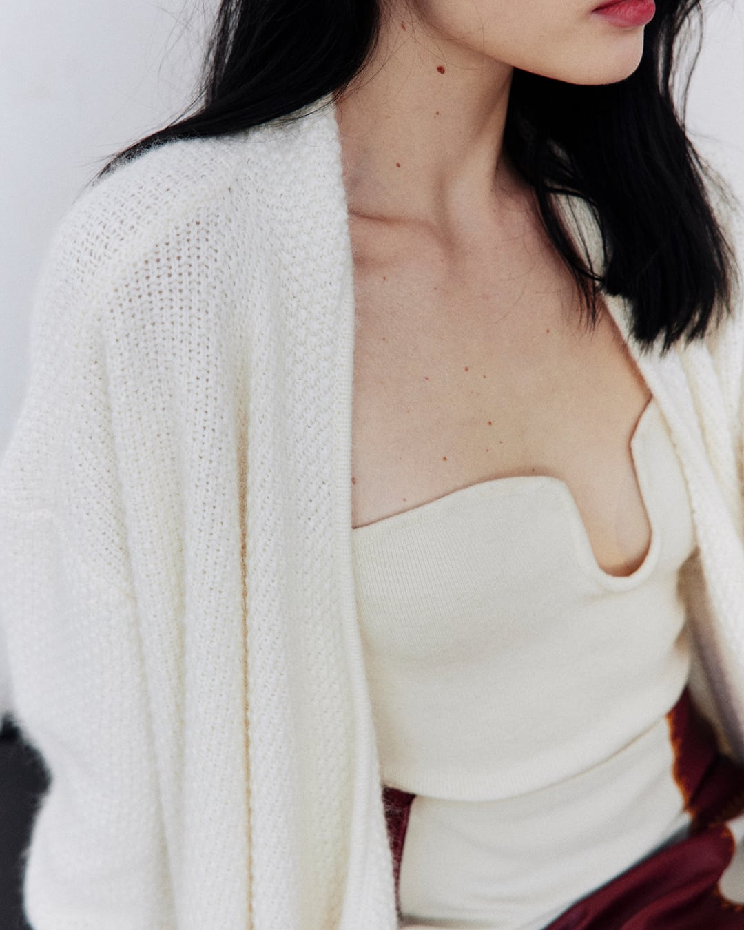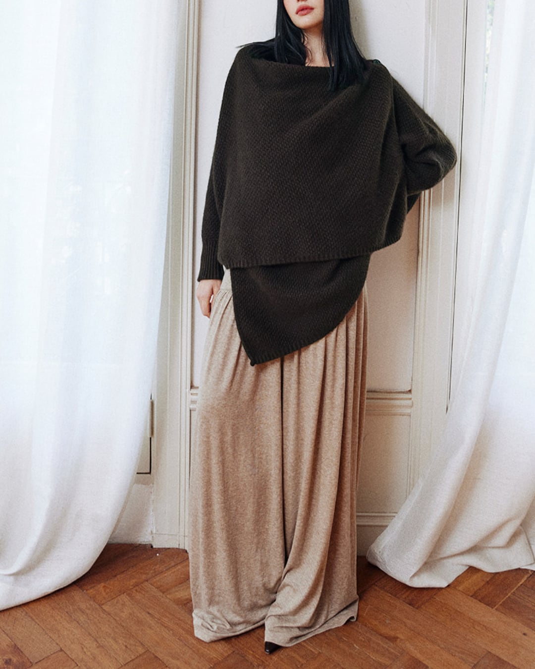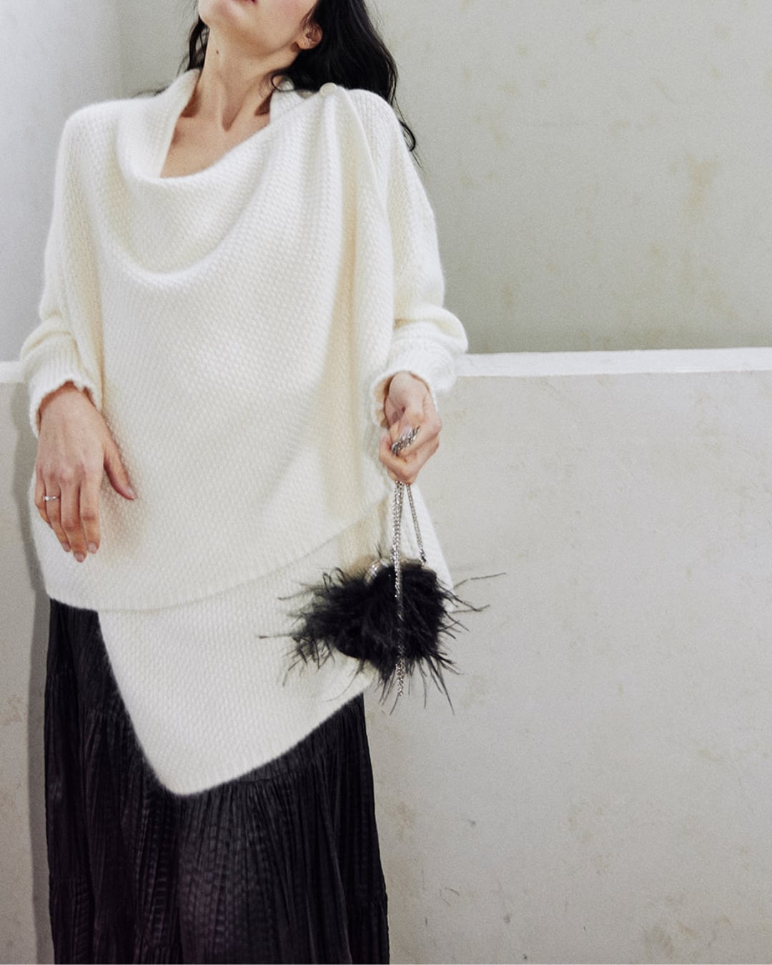 前後2WAYで着られるゆるシルエットのドレープカーディガン。ボタンの留め方によってシルエットが変化し、スタイリングの幅が広がります。しっかりと厚みのあるニットで防寒性も◎