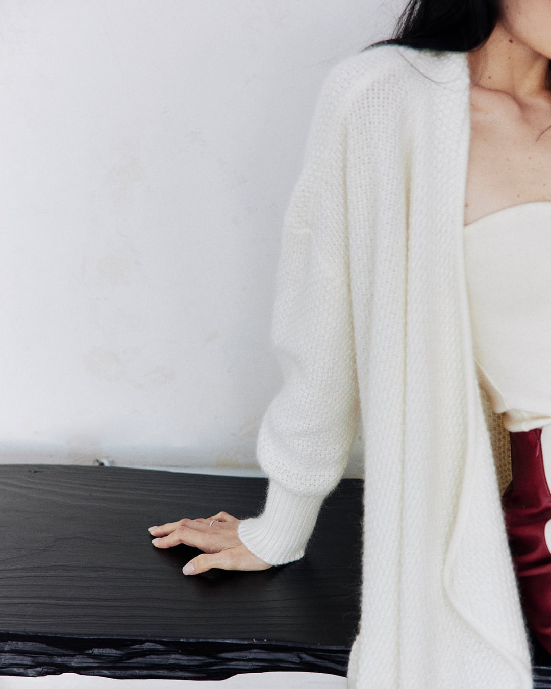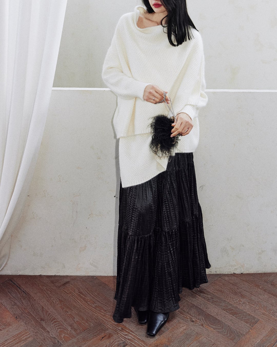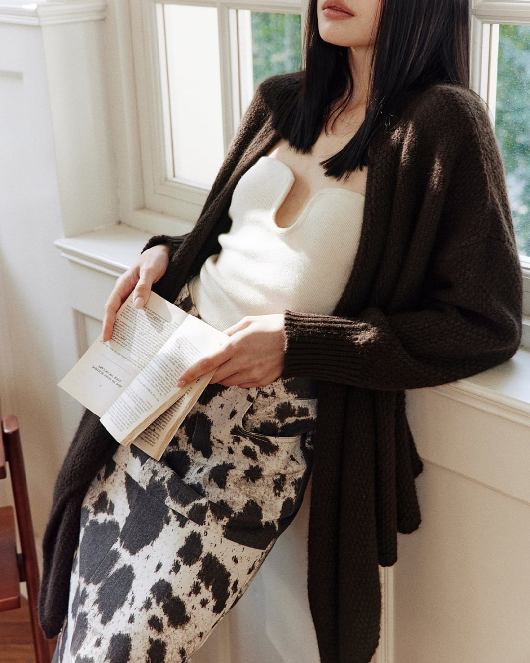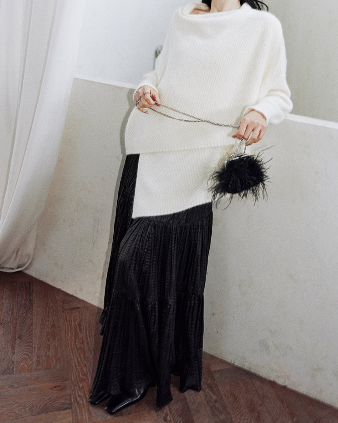 前後2WAYで着られるゆるシルエットのドレープカーディガン。ボタンの留め方によってシルエットが変化し、スタイリングの幅が広がります。しっかりと厚みのあるニットで防寒性も◎