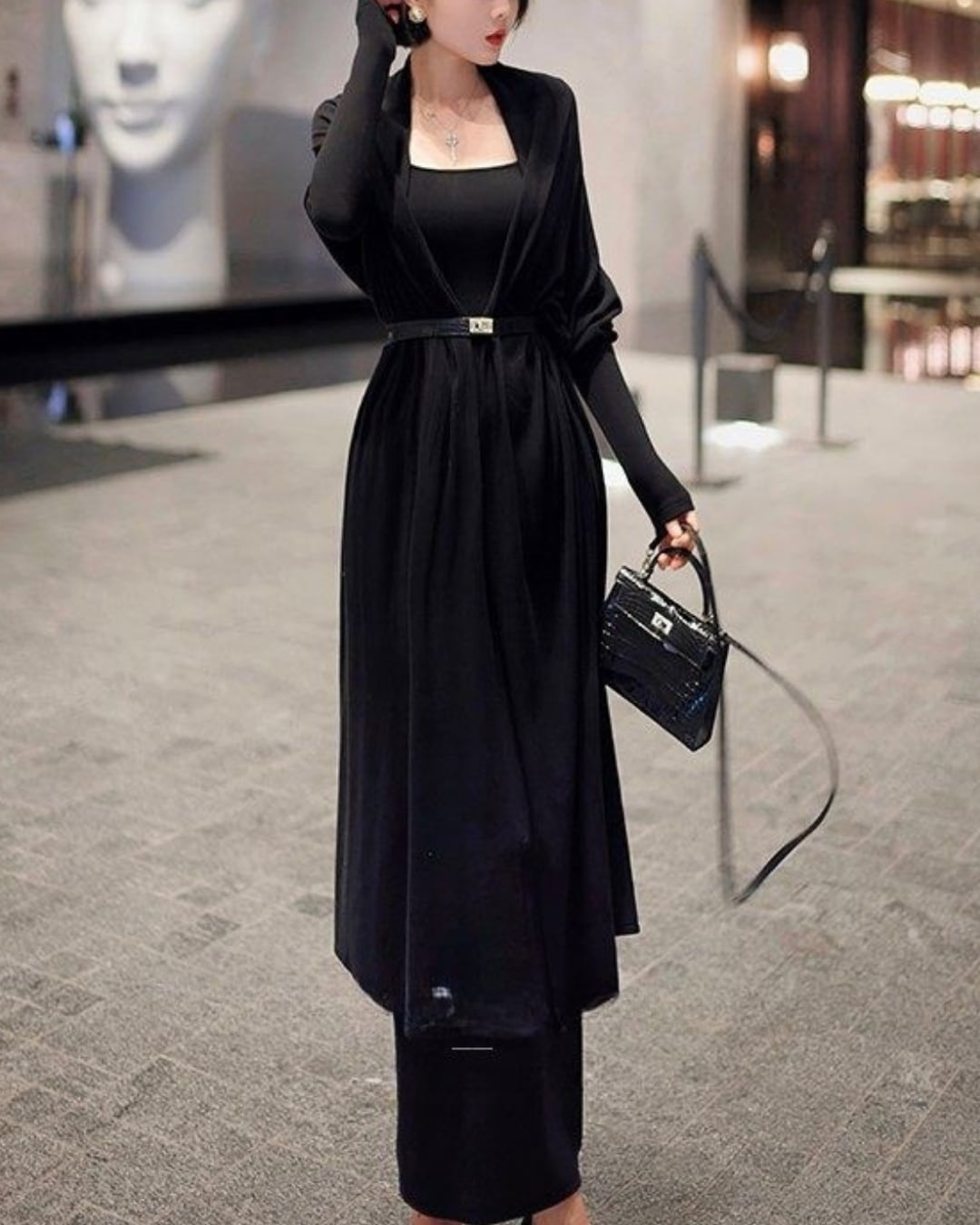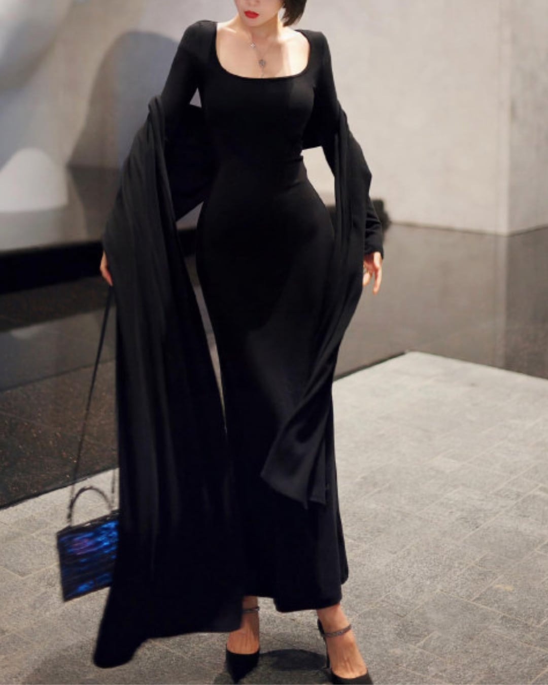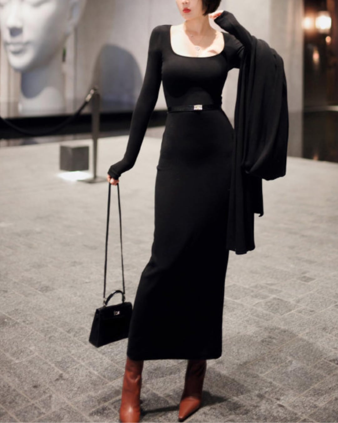 上品な色気を放つロングタイトワンピース。デコルテを美しく魅せるスクエアネックとボディラインにフィットするシルエットが、洗練された印象を演出します。セットのストールは首元に巻いたり、肩にかけたりと着こなしの幅が広がる2WAY仕様。オケージョンからデイリーまで幅広く活躍する一枚です。