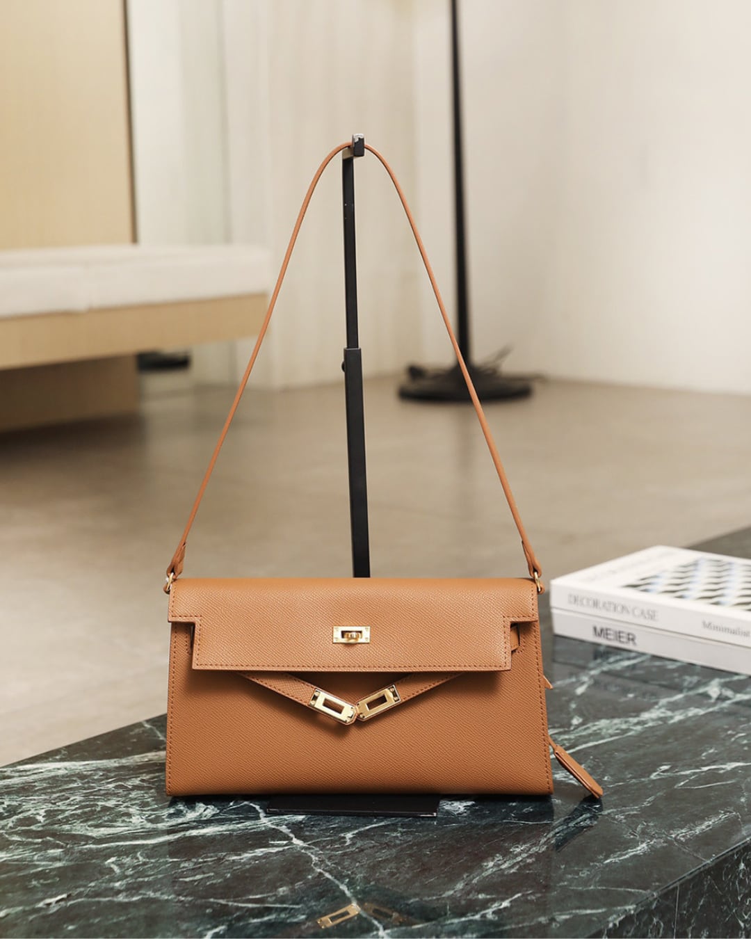 洗練されたスクエアフォルムに、ゴールド金具が上品なアクセントを添えるレザーバッグ。ショルダーストラップ付きで、肩掛け・クラッチの2WAYで使える仕様。上質な牛革を使用し、しっかりとした質感と高級感のある見た目が魅力です。ミニマルなデザインで、オンオフ問わず使いやすく、デイリーからフォーマルまで幅広く活躍します。