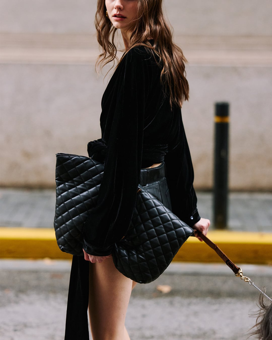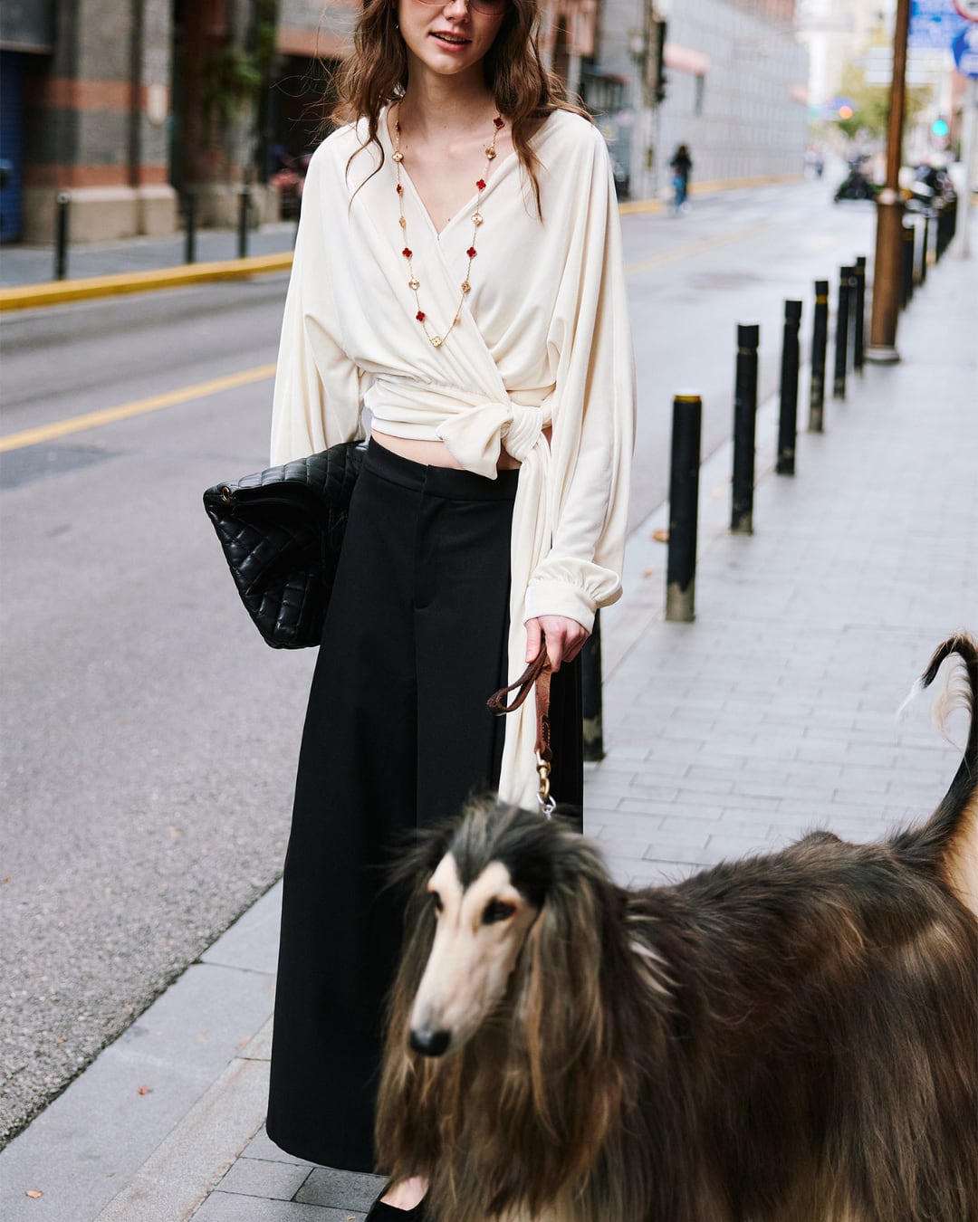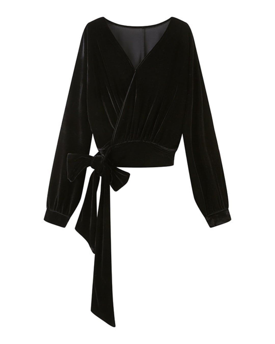 柔らかなドレープ感と艶のある生地が魅力のブラウス。大胆なウエストリボンがポイントで、フロントでもサイドでも結べるアレンジ自在な一枚。たっぷりとした袖と深めのVネックが女性らしさを引き立て、シンプルながらも洗練された印象を演出します。