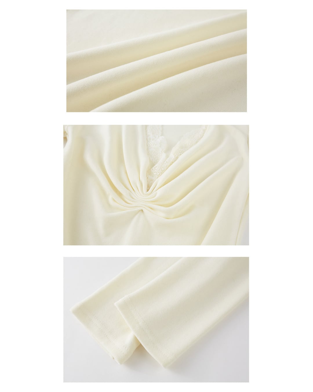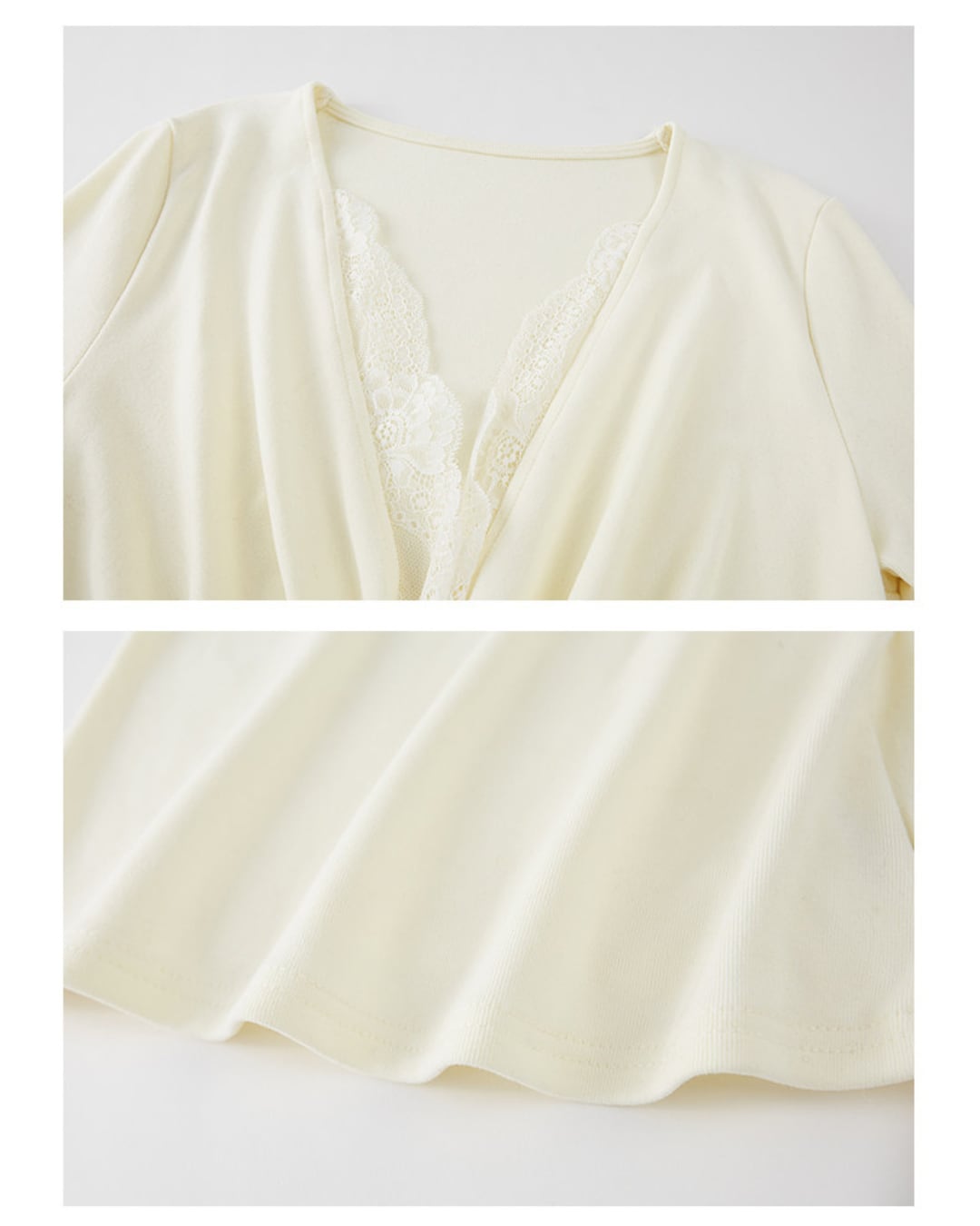 デコルテ部分にレースをあしらったVネックデザインの長袖トップス。胸元のギャザーが女性らしい立体感を演出し、身体に程よくフィットするシルエットが特徴です。1枚でも、インナーとしても着用しやすいデザインです。
