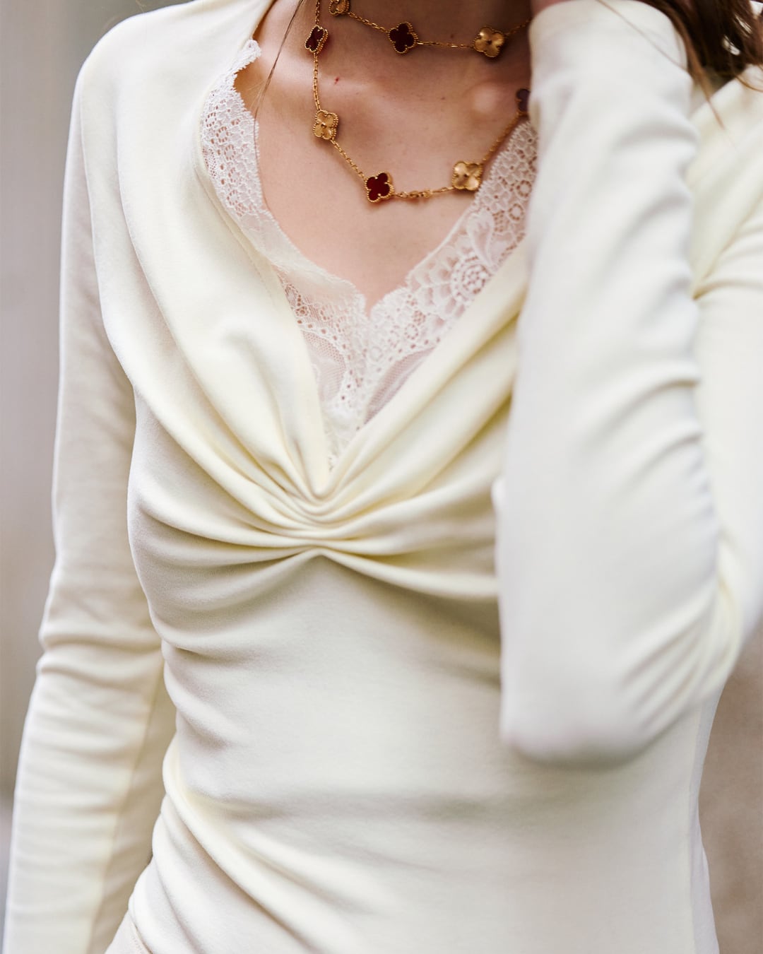 #レーストップス #Vネック #ギャザー #長袖 #シンプル #大人コーデ