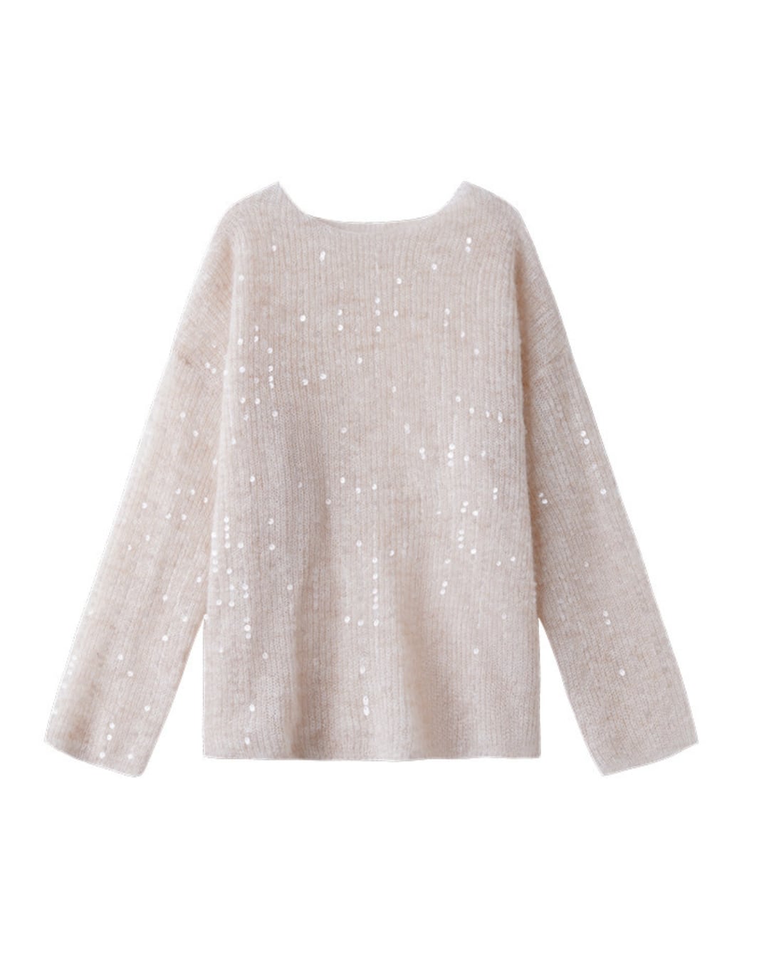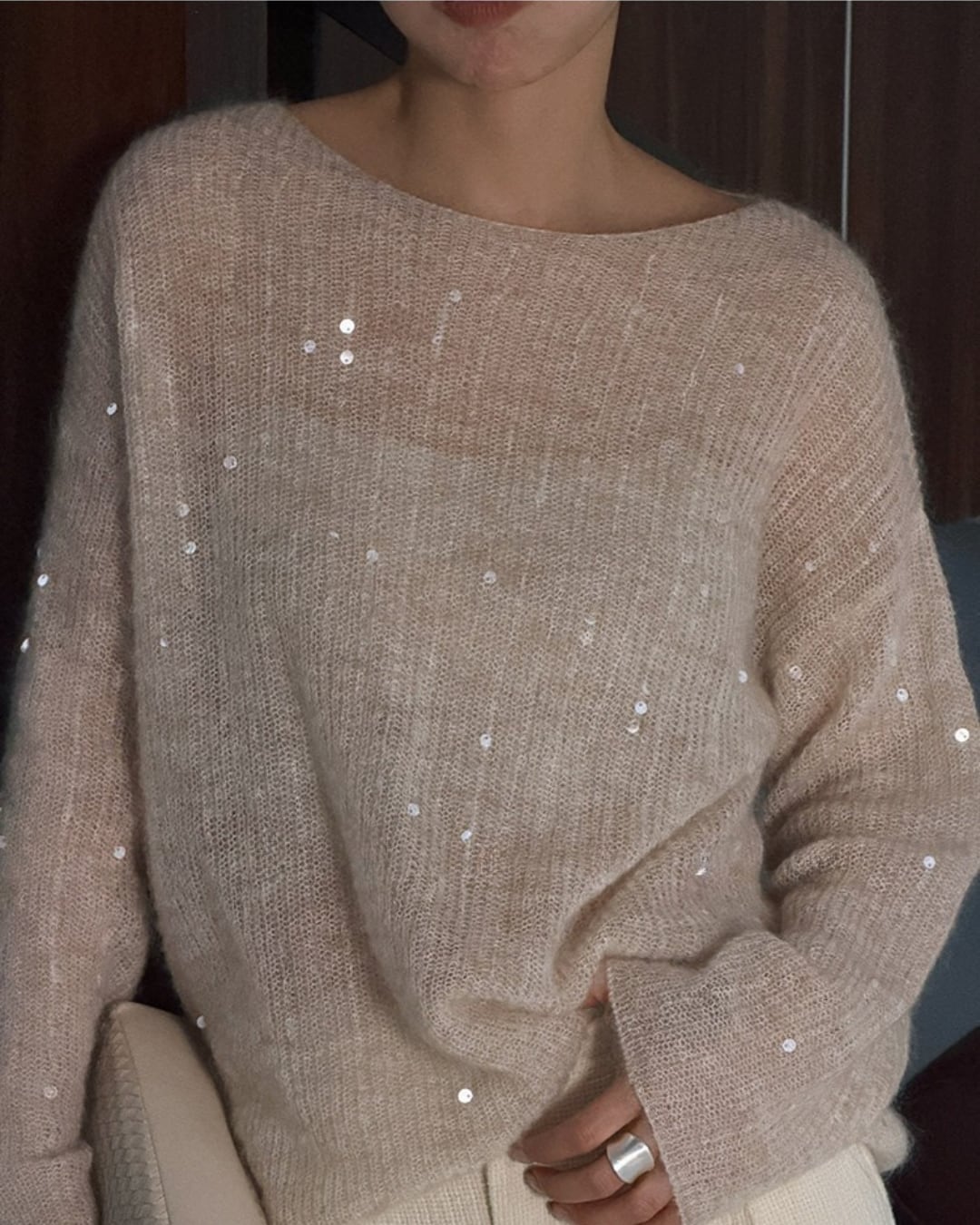 繊細なスパンコールを散りばめた、上品な輝きが特徴のニットトップス。ゆったりとしたシルエットと柔らかな編み地が、リラックス感のある大人のスタイルを演出します。一枚で存在感があり、シンプルなボトムスと合わせるだけで洗練されたコーディネートが完成します。