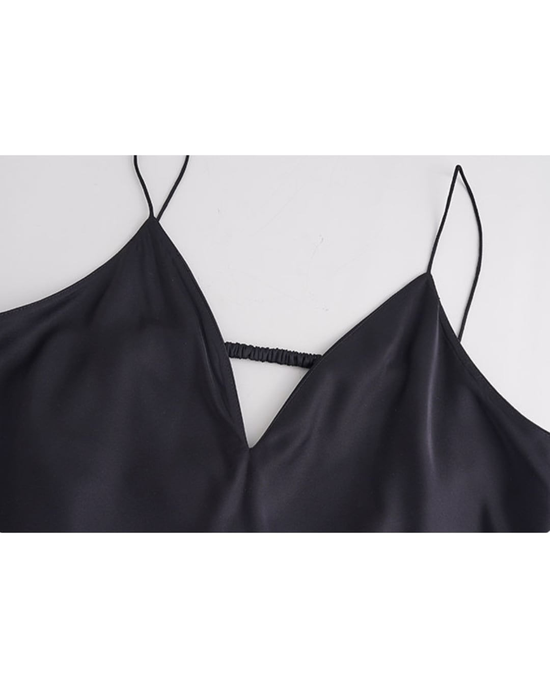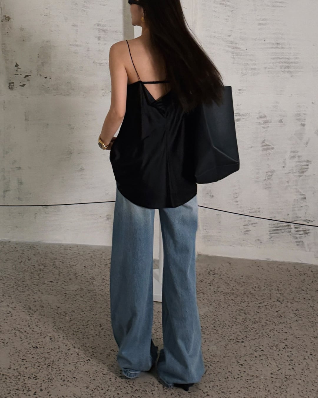 落ち感の美しいサテン素材を使用した、ミニマルで洗練されたキャミソールトップス。華奢なストラップとVネックラインがデコルテをすっきりと見せ、1枚でもレイヤードでも活躍するデザインです。ジャケットやニットのインナーとしても使いやすく、シーズンレスに着回しが可能。程よい光沢感が、日常からきれいめスタイルまで幅広く対応します。