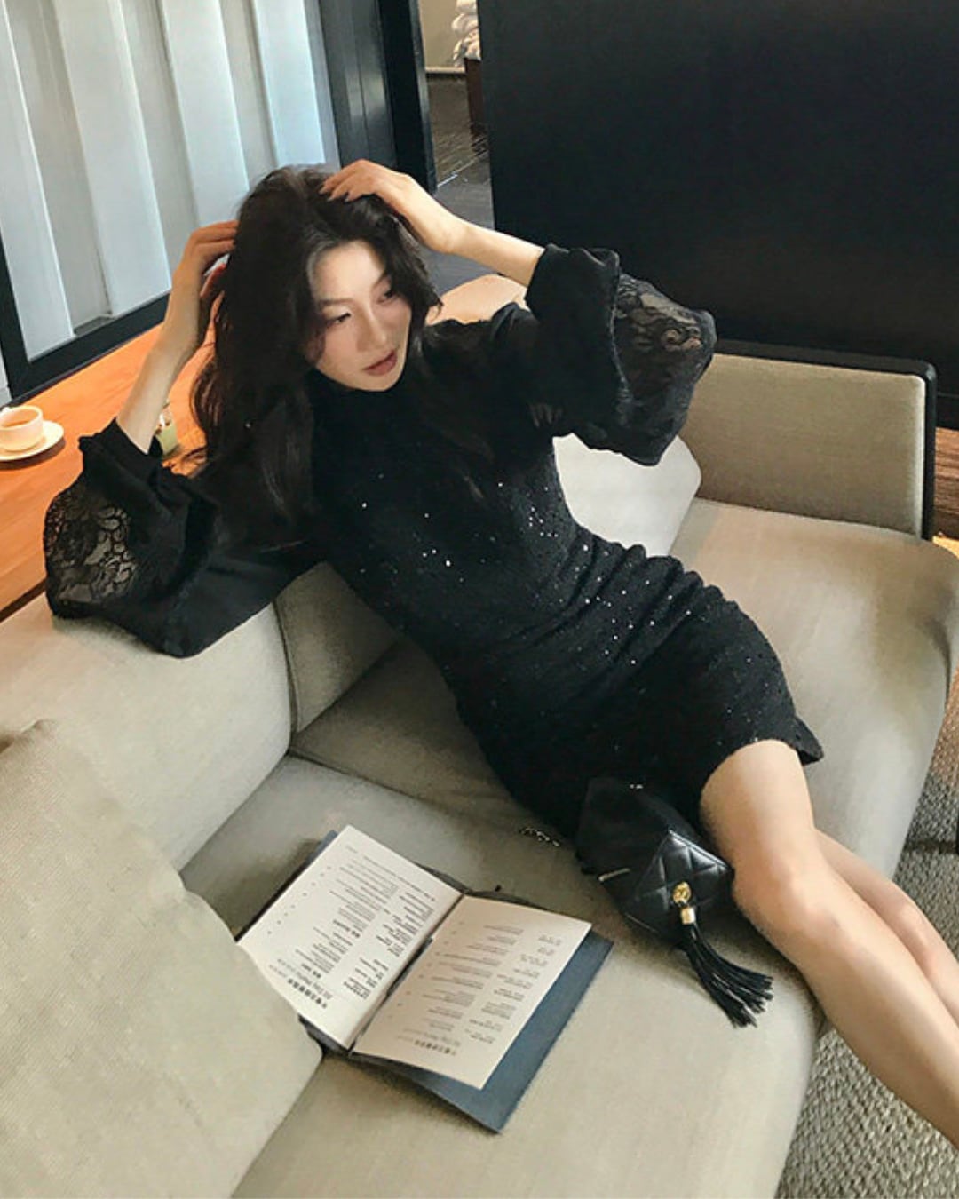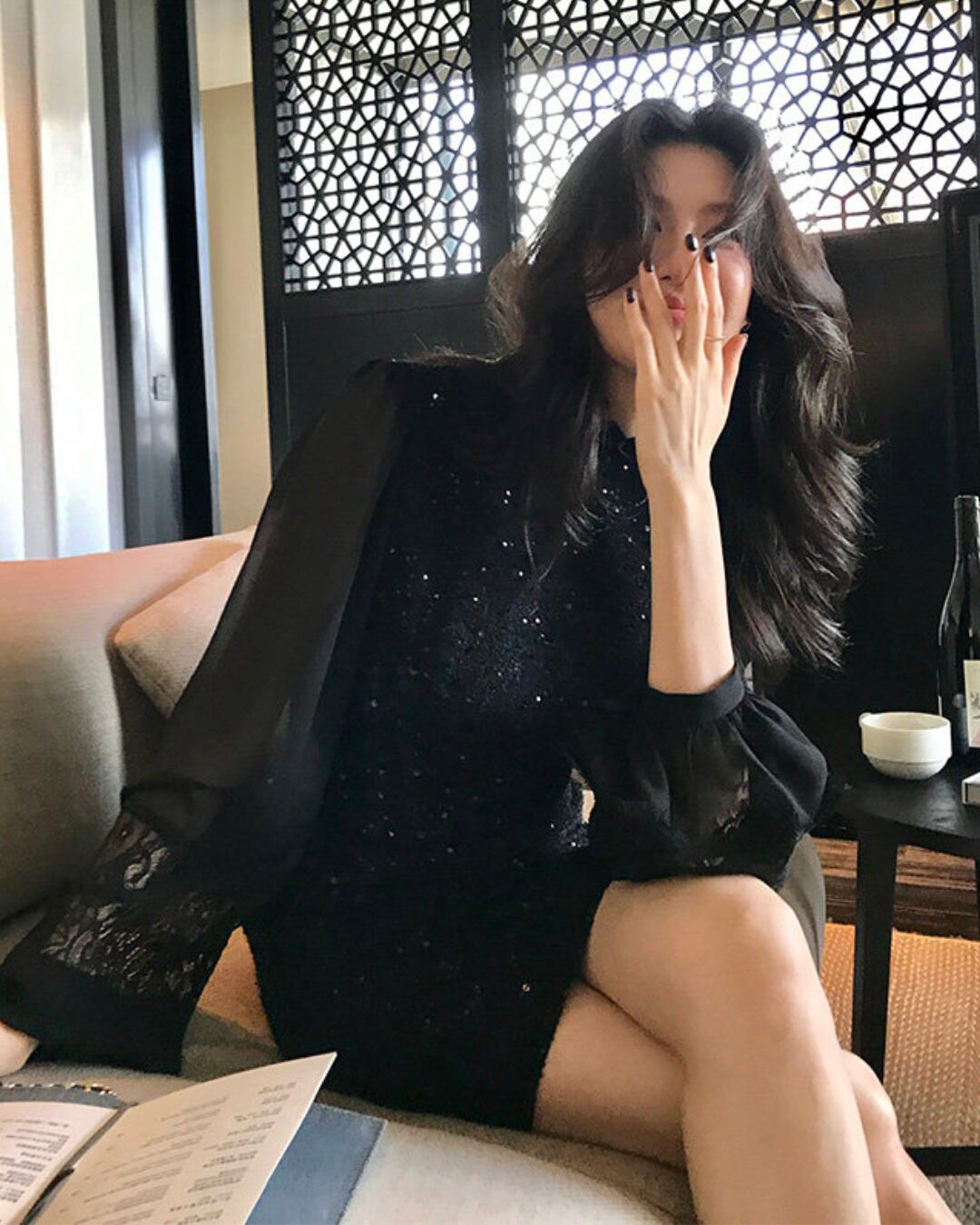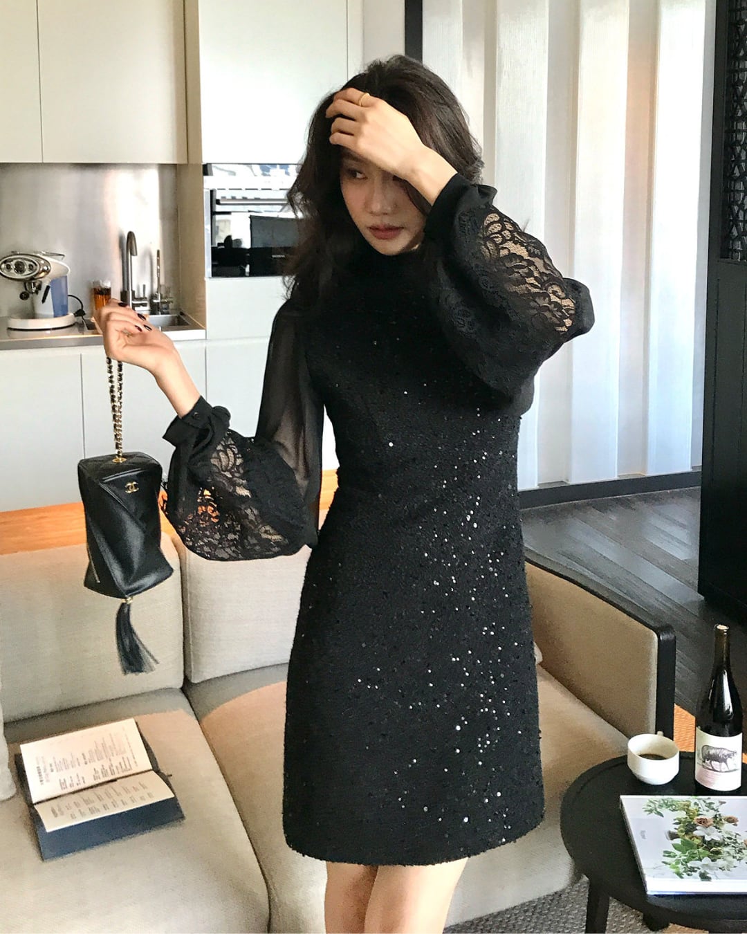 #ブラックワンピース #レーススリーブ #スパンコール #フェミニンコーデ #お呼ばれコーデ #高見えアイテム