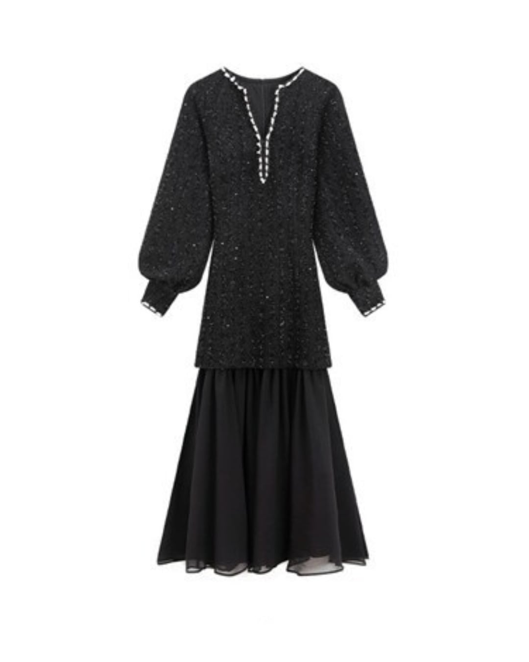上半身には繊細なスパンコールが煌めき、裾は軽やかなティアードシフォンで切り替えたラグジュアリーな一枚。立体感のあるパフスリーブとデコルテを美しく魅せるVネックがエレガントさを演出。パーティーやディナー、お呼ばれにぴったりの主役級ドレスワンピースです。季節を問わず使える万能デザインで、1枚で洗練された印象に。