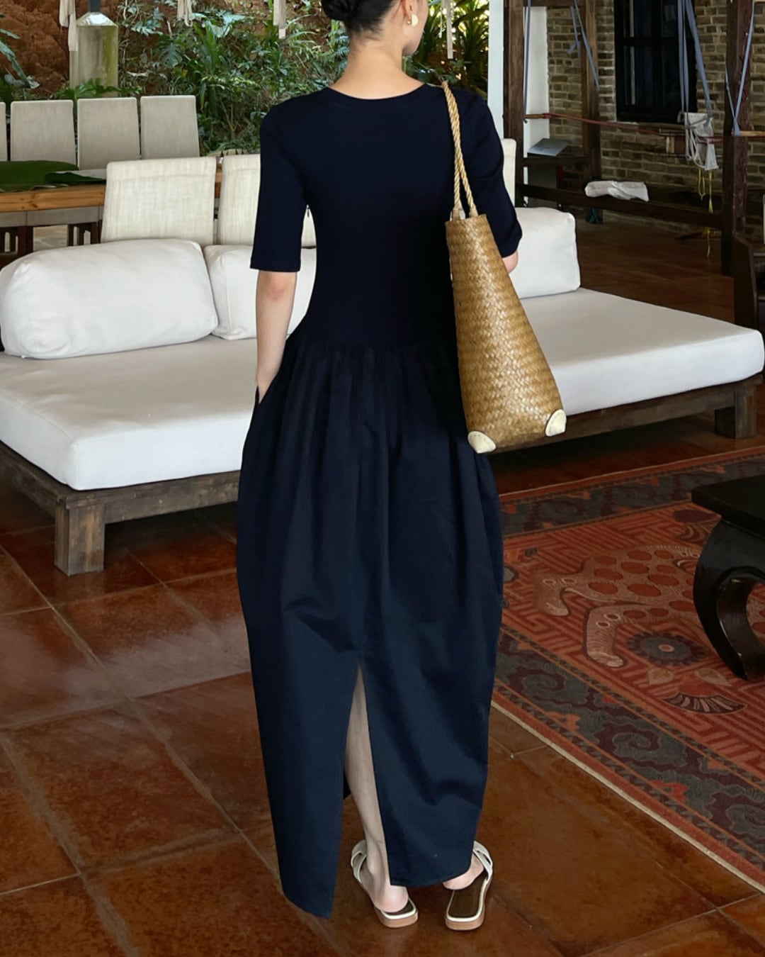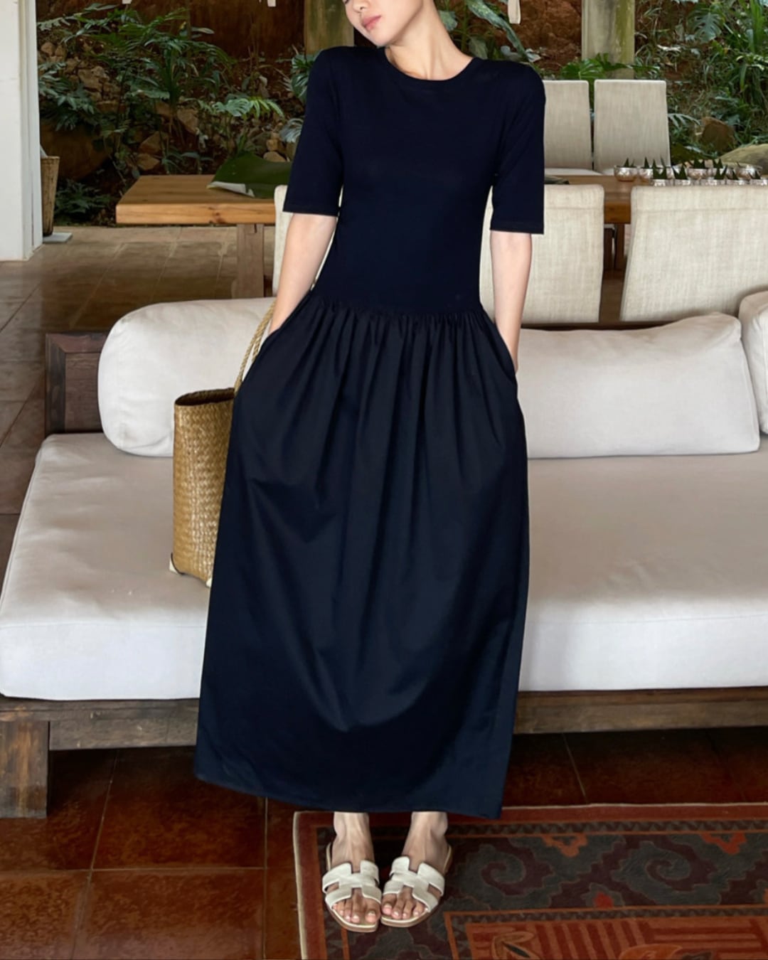 上品さとカジュアルさを兼ね備えた異素材コンビワンピース。トップス部分はリブニット素材で柔らかくフィットし、気になる二の腕をカバーしてくれる五分袖仕様。スカート部分はハリのあるコットン素材で、自然なフレアが生まれ体型を美しくカバーしてくれます。1枚でさらっと決まり、通勤から休日スタイルまで幅広く活躍する万能ワンピ。シンプルながらもシルエットにこだわりが詰まった一着です。