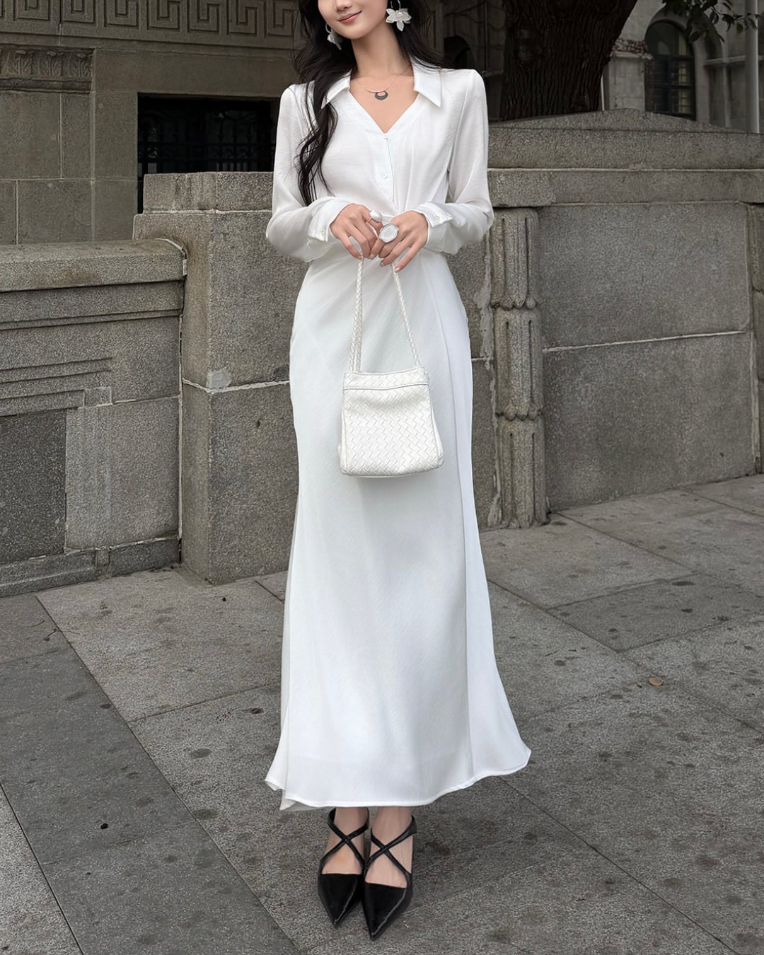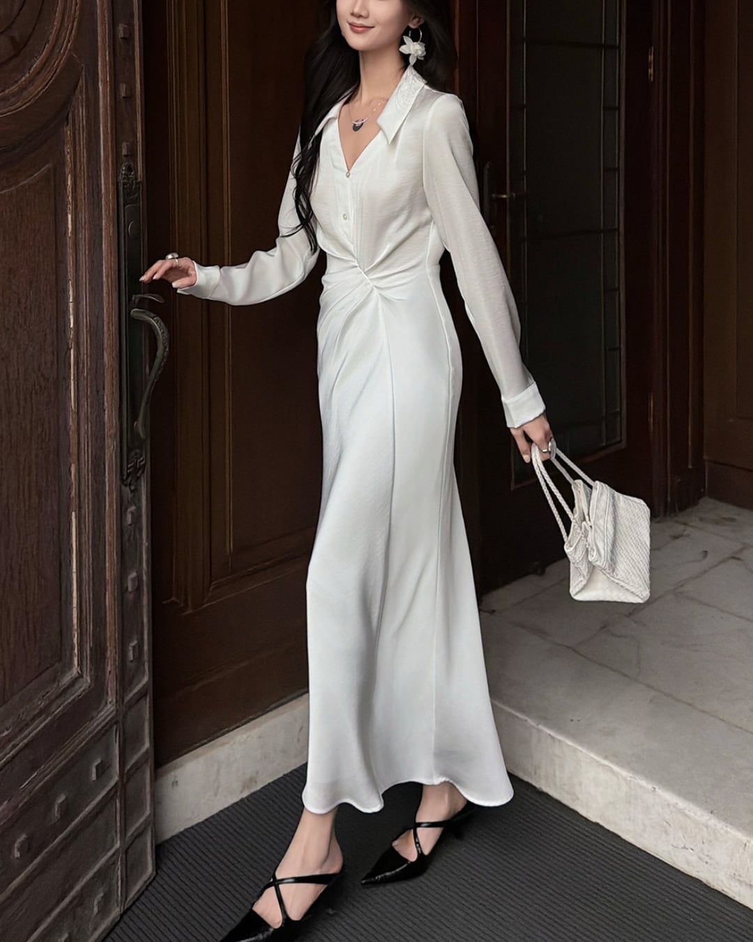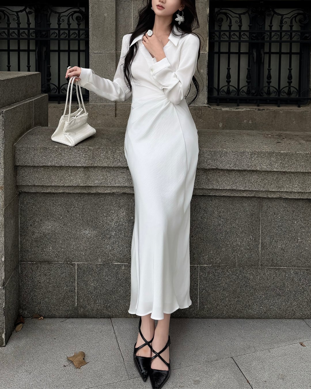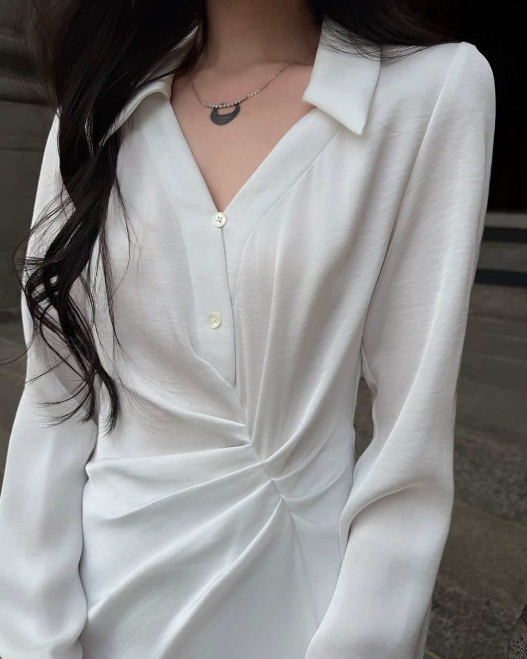 滑らかな光沢感が魅力のサテンライクワンピース。シャツ風デザインにウエストのタックディテールをプラスすることで、スタイルアップを叶える1着に仕上がっています。スカート部分は落ち感が美しく、歩くたびに優雅に揺れる上品なシルエット。結婚式の二次会やディナー、ちょっとしたお出かけにもぴったりのエレガントワンピです。アクセサリーやバッグで自分らしいスタイリングも楽しめます◎