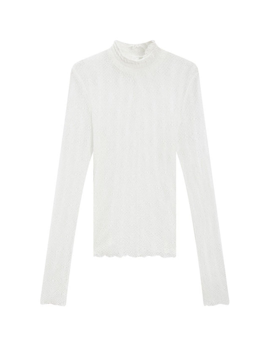 透け感のあるレース素材を使用したハイネックインナートップス。柔らかく伸縮性があり、肌に優しくフィットする着心地。単品使いはもちろん、ジャケットやアウターのインナーとしても上品に馴染む一枚です。