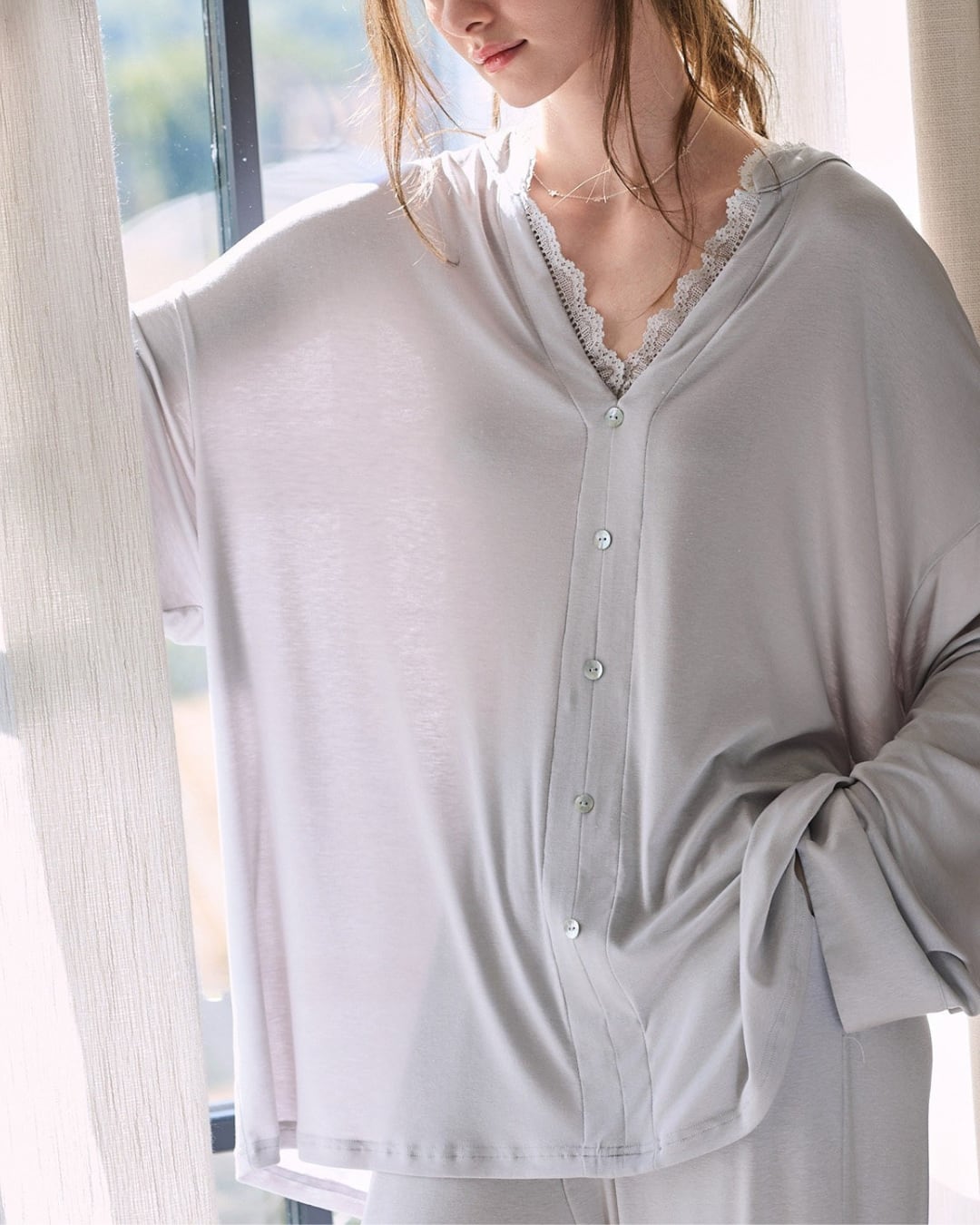 とろみのある柔らかな素材感が魅力のルームウェアセット。ゆったりとしたシルエットで、リラックスしながらも女性らしさを感じられるデザインです。トップスはフロントボタン仕様のVネックデザイン。ネックラインには繊細なレースが施され、上品で柔らかな印象に仕上がっています。パンツは落ち感のある生地が美しく、動くたびにしなやかに揺れます。おうち時間はもちろん、リラックスタイムを快適に過ごせる一着です。