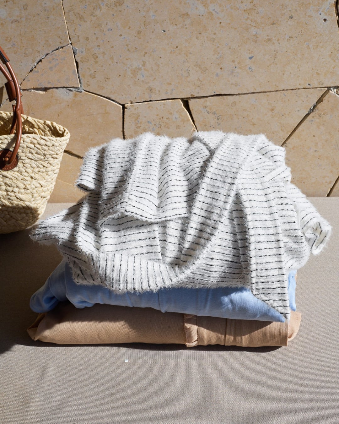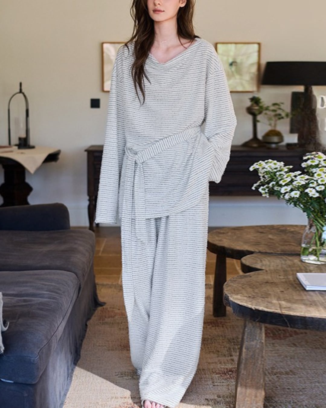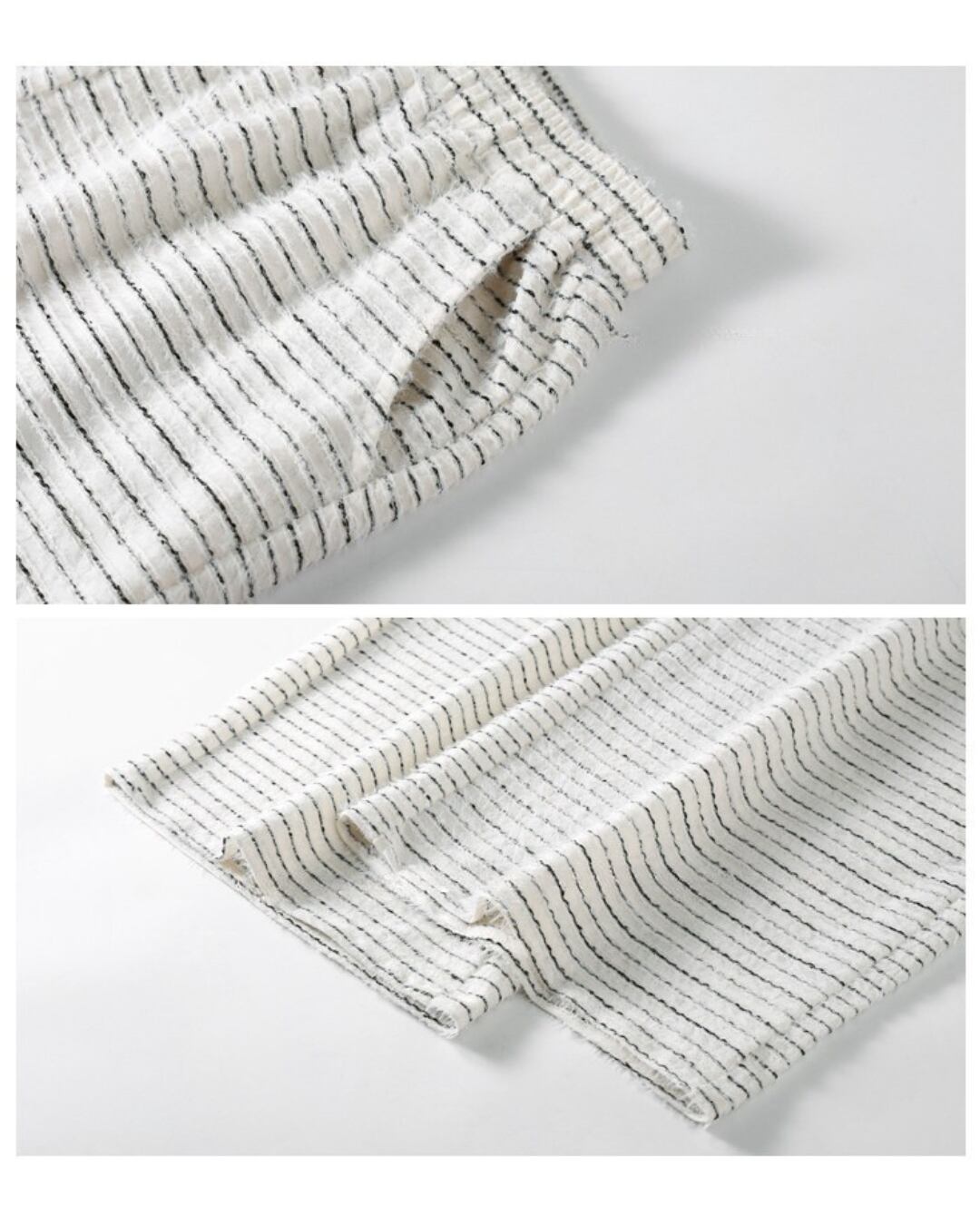細めのボーダーデザインが上品な印象を与えるルームウェアセット。柔らかな風合いとゆったりとしたシルエットで、抜け感のあるリラックススタイルを演出します。トップスは自然なドレープが生まれるネックラインと、ゆったりとしたドルマンスリーブデザイン。パンツは締め付け感の少ないワイドシルエット。おうち時間はもちろん、ワンマイルウェアとしても活躍するセットアップです。