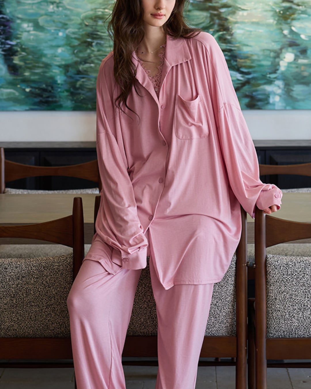 #ルームウェア #セットアップ #ピンクコーデ #レースデザイン #リラックスウェア #ワイドパンツ
