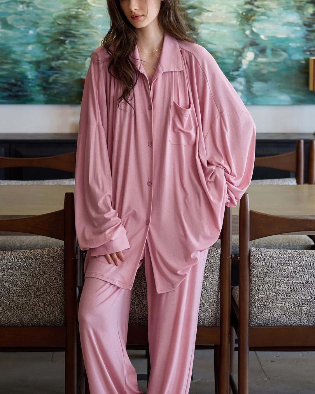 とろみのある柔らかな素材感が魅力のルームウェアセット。ゆったりとしたシルエットと落ち感のある生地が、大人のリラックスタイムを上品に演出します。トップスはフロントボタン仕様のオーバーシルエットデザイン。胸元から覗くレースインナーが女性らしさをプラスします。ヒップラインをさりげなくカバーする丈感で、抜け感のある着こなしに。パンツはストレスフリーなワイドシルエット。しなやかに揺れる素材感で、快適な履き心地です。おうち時間はもちろん、ワンマイルウェアとしても活躍するセットアップです。