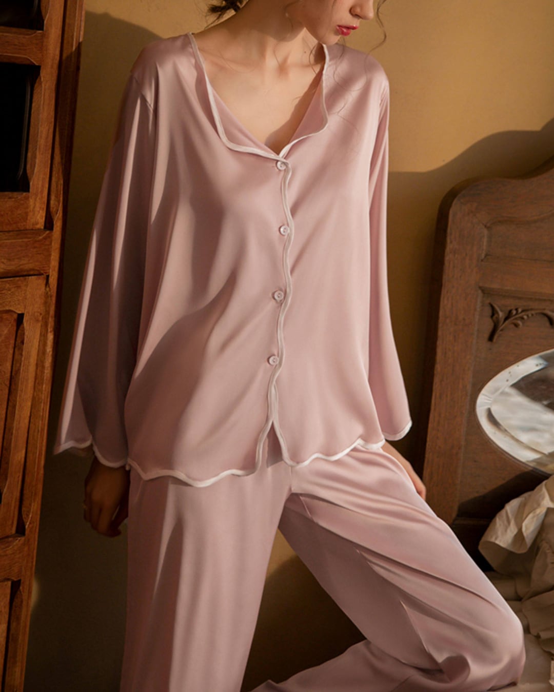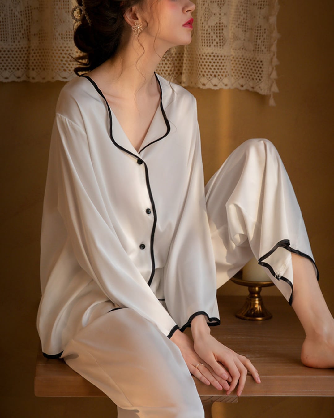 #ルームウェア #セットアップ #パイピングデザイン #大人リラックス #サテン風 #ワイドパンツ