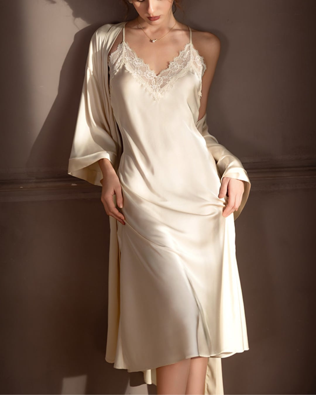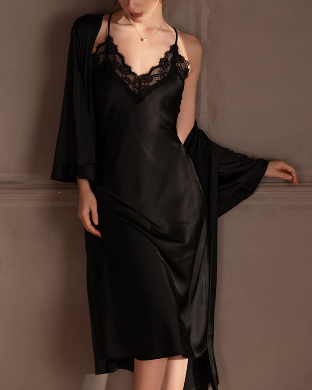 上品な光沢感が魅力のキャミワンピースとロングガウンの2点セット。なめらかな素材が身体に沿い、美しいドレープを描きます。ワンピースは華奢なストラップとVネックレースデザイン。デコルテを美しく見せ、女性らしいシルエットを引き立てます。ロングガウンはさらっと羽織れる軽やかな着心地。動くたびに揺れる落ち感がエレガントな印象を演出します。おうち時間はもちろん、ナイトウェアとしても華やかさをプラスしてくれるセットです。