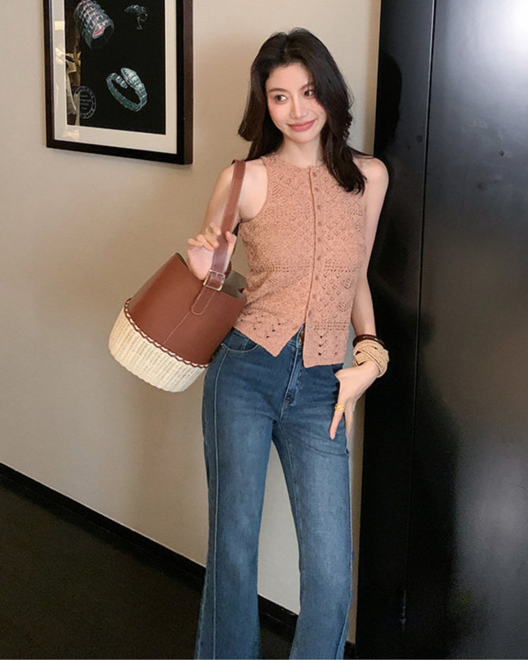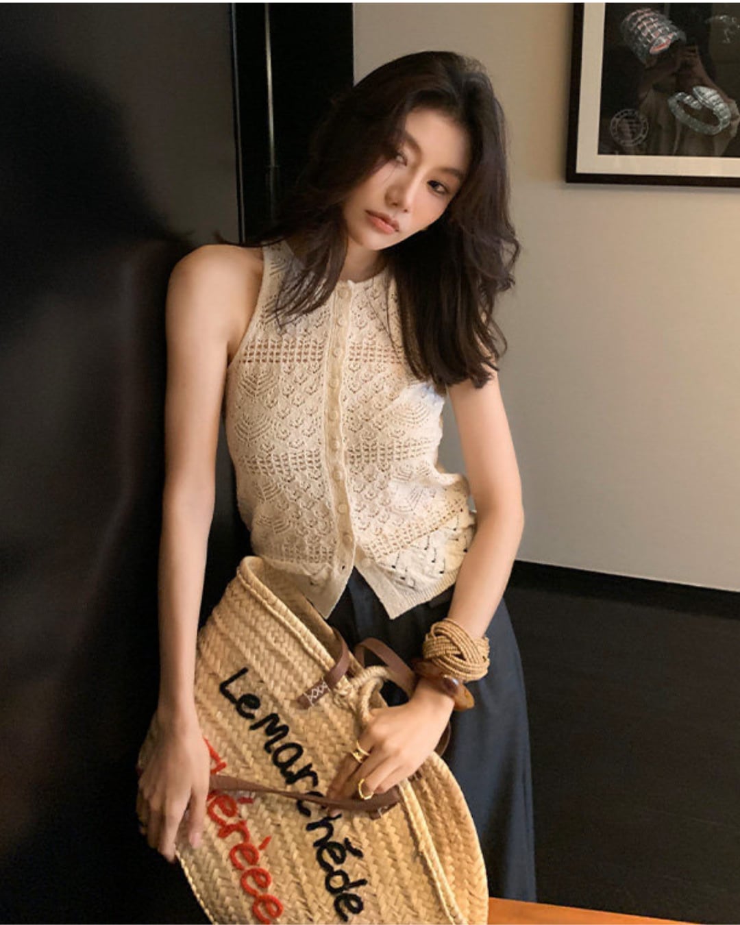 繊細な透かし編みが目を惹く、上品なクロシェニットベスト。立体感のある編み模様がコーディネートに奥行きをプラスし、一枚で主役になる存在感。フロントボタンデザインで、トップスとしても羽織りとしても着回し可能。コンパクトな丈感でウエストラインをすっきり見せ、ハイウエストボトムとの相性も抜群。デニムでカジュアルに、スラックスで大人っぽくまとめるのもおすすめ。春夏シーズンに活躍する、軽やかなニットアイテムです。