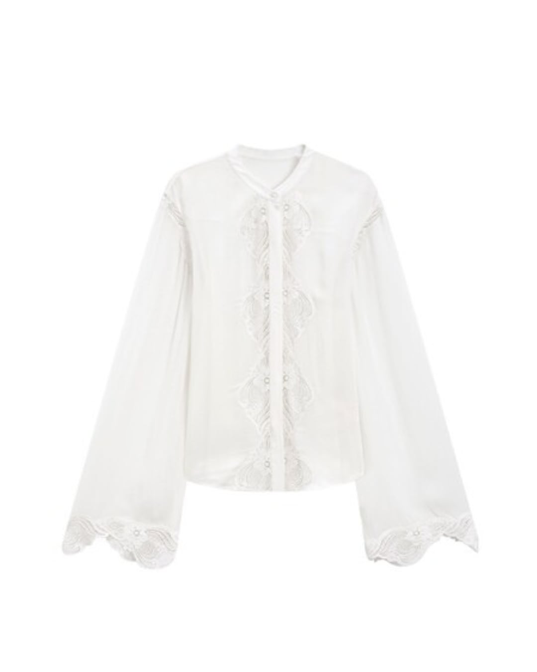 繊細なレースを贅沢にあしらったデザインブラウス。なめらかで軽やかな素材感が、上品で洗練された印象を演出します。フロントから裾へと続くレースディテールが華やかさをプラス。袖口や肩にもレースを施し、全体に統一感のある仕上がりに。ややゆとりのあるシルエットで、さりげなく体型をカバー。立ち上がりのあるネックデザインが、甘さの中にきちんと感を添えます。パンツにもスカートにも合わせやすく、一枚でコーディネートの主役になるアイテムです。