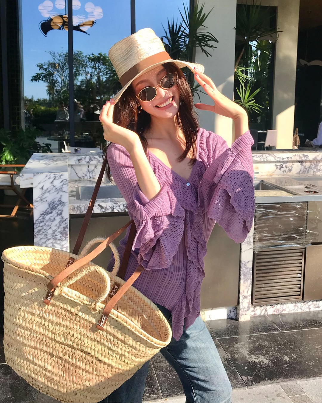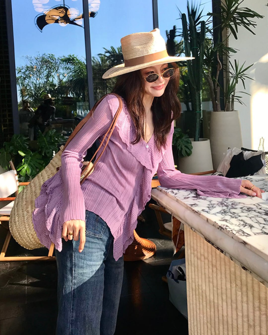 #フリルトップス #Vネックトップス #フレアスリーブ #リブニット #フェミニンコーデ #大人カジュアル #春コーデ
