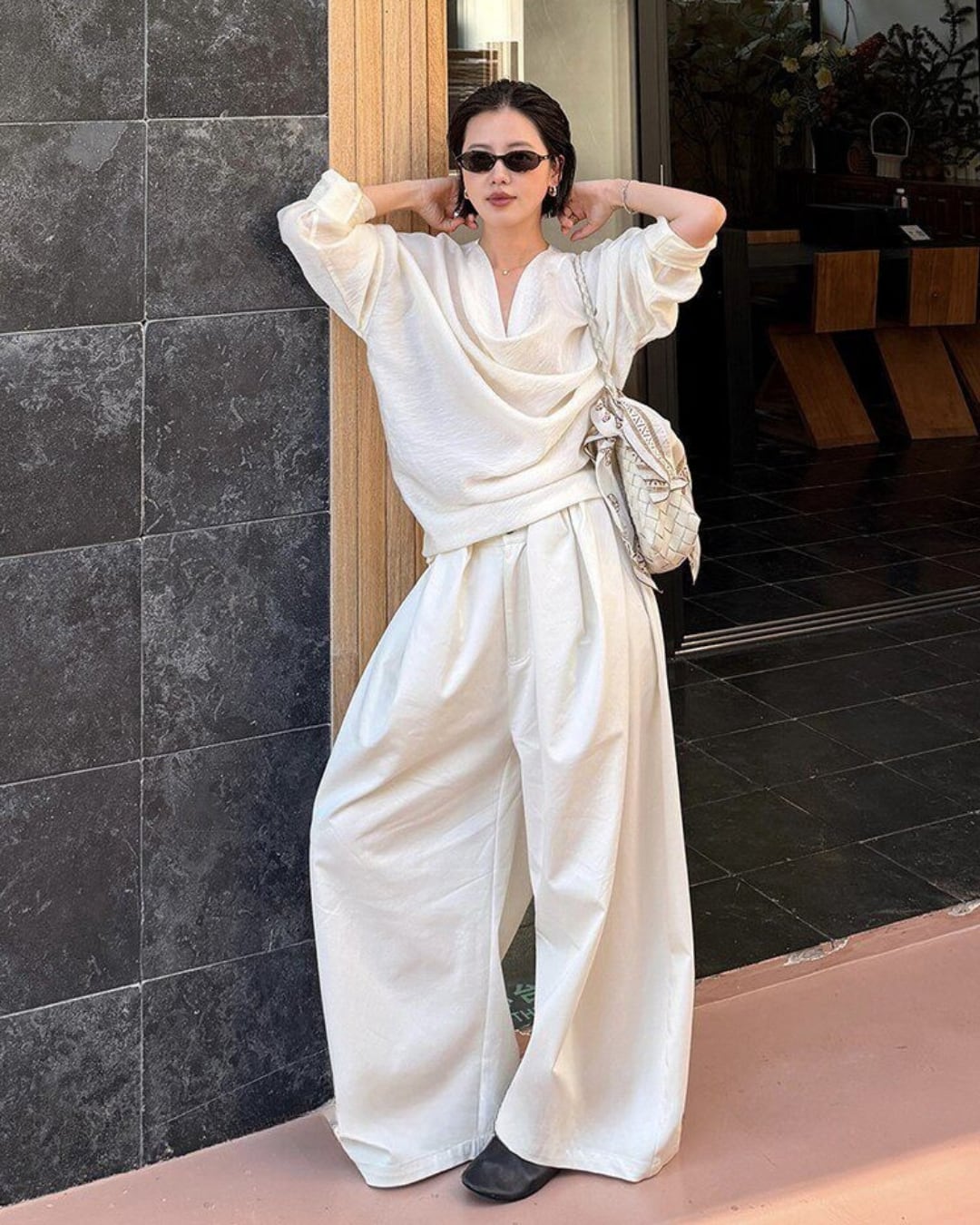 柔らかなドレープネックが印象的なルーズシルエットブラウス。ゆったりとした肩落ちデザインで、抜け感のある大人スタイルを演出します。軽やかな素材感で動きに合わせて自然なドレープが生まれ、シンプルながら洗練された雰囲気に。デニムやスラックス、スカートなど幅広いボトムスと相性の良い一着です。
