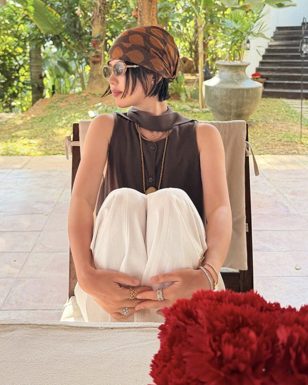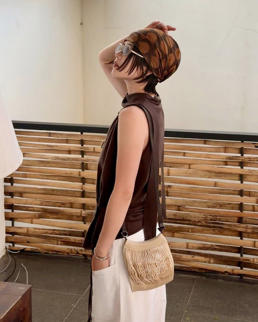 フロントのドレープデザインが印象的なノースリーブトップス。柔らかな素材感と立体的なシルエットで、シンプルながらも洗練された雰囲気を演出します。首元のリボンディテールがアクセントになり、コーディネートに程よい存在感をプラス。ワイドパンツやスラックスと合わせた大人のリラックススタイルにおすすめの一着です。