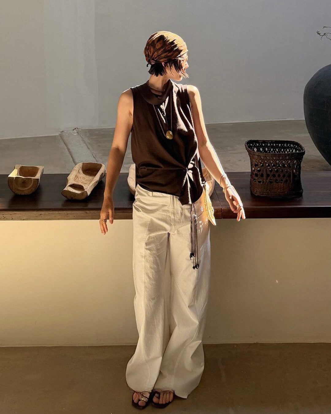 #ノースリーブトップス #ドレープトップス #大人カジュアル #シンプルコーデ #夏コーデ #リラックススタイル