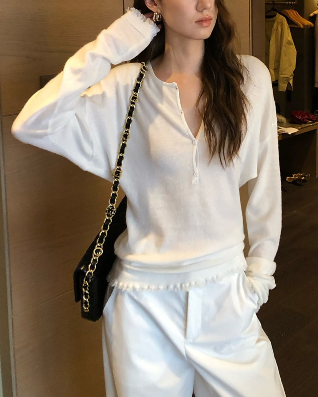 柔らかな風合いのニット素材を使用したヘンリーネックトップス。フロントのボタンデザインと、袖口や裾に施されたフリンジディテールがさりげないアクセントに。すっきりとしたシルエットでボトムを選ばず、デイリーコーデに取り入れやすい一着です。シンプルながらもこなれた雰囲気を演出する大人カジュアルアイテム。