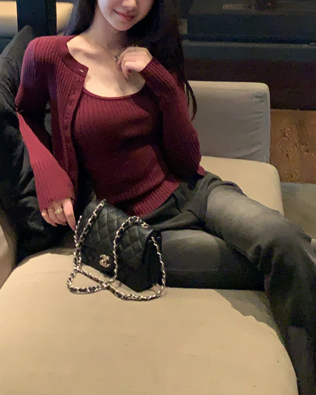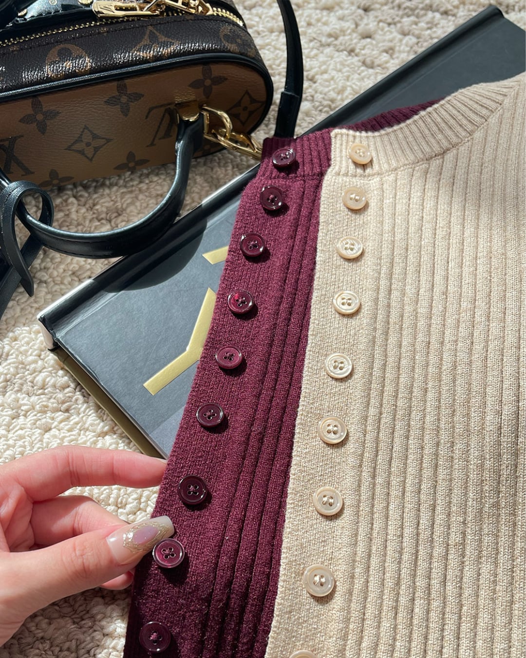 バイカラーのボタンデザインが印象的なリブニットアンサンブル。カーディガンとキャミソールのセットで、女性らしいシルエットを美しく引き立てます。リブ素材がボディラインに程よくフィットし、上品で洗練されたスタイルに。セットでも単品でも着回ししやすく、幅広いコーディネートに活躍するアイテムです。