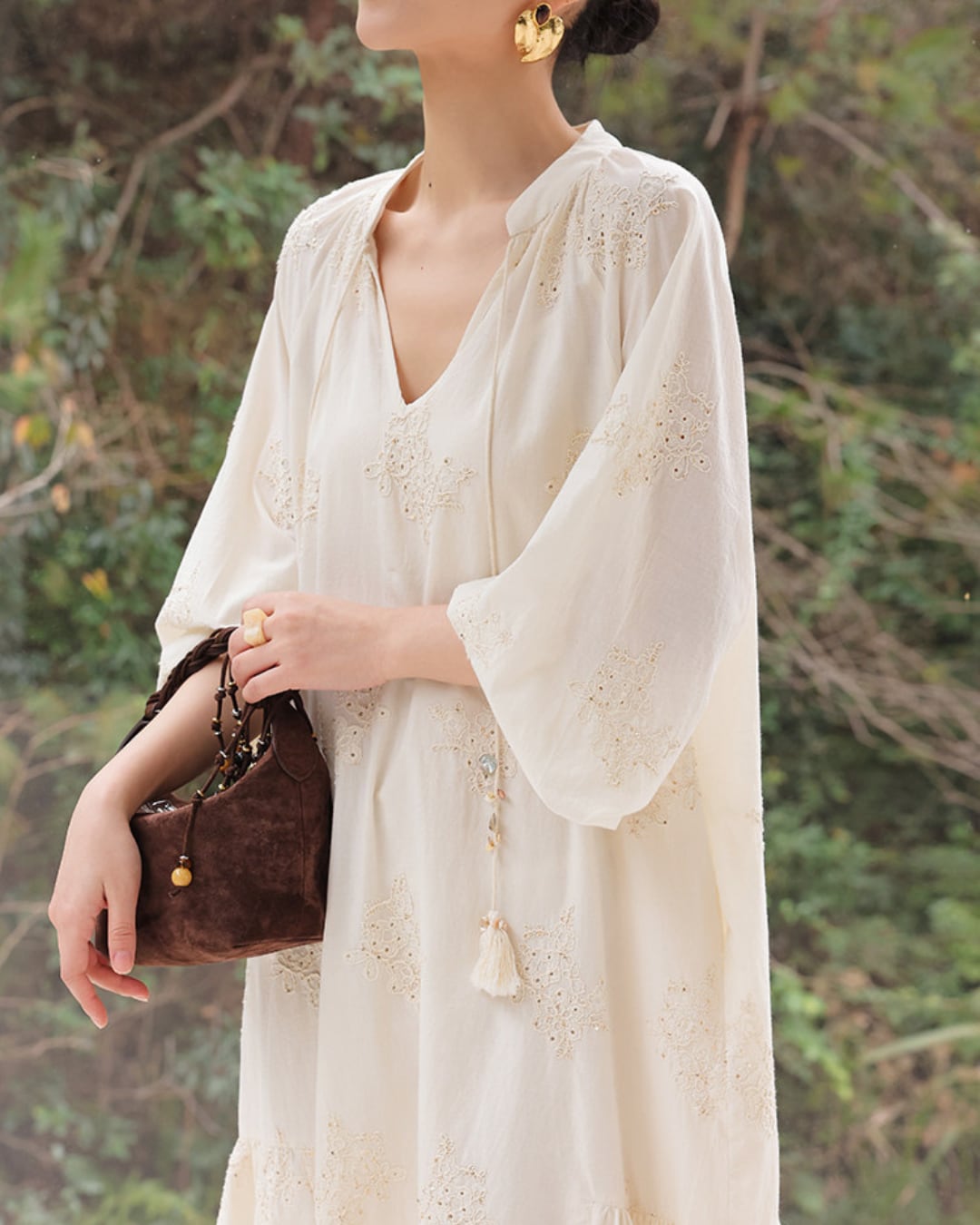 柔らかなコットン素材に繊細な刺繍レースを施したロングワンピース。ゆったりとしたシルエットとボリュームスリーブがナチュラルで上品な雰囲気を演出します。首元のVネックデザインとタッセルリボンがアクセントになり、リラックス感のある大人のスタイルに。リゾートや休日コーデにもぴったりの一着です。