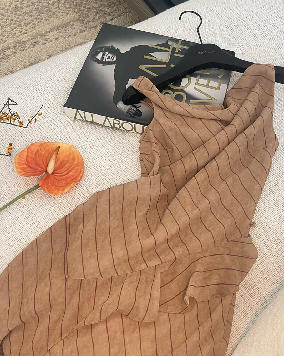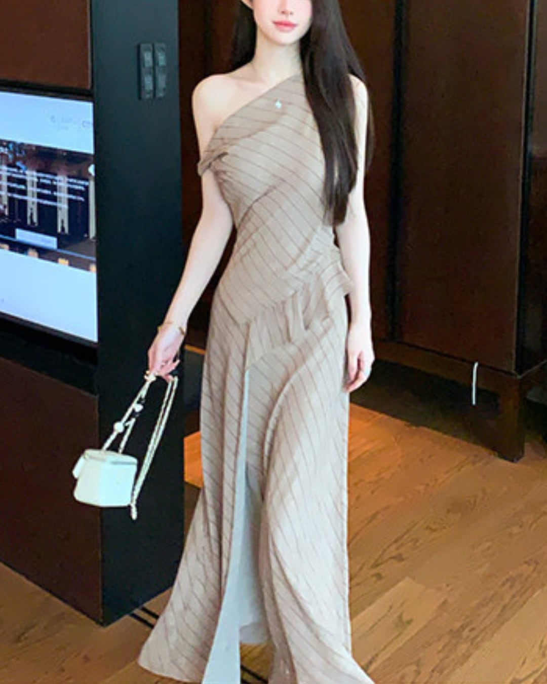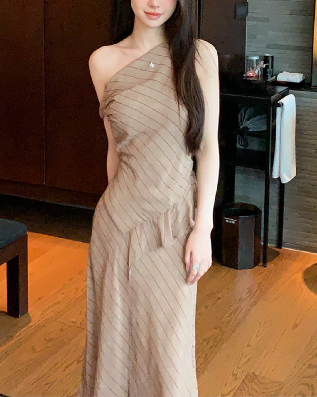 ワンショルダーデザインが印象的なストライプワンピース。斜めに入ったストライプとウエストのドレープが美しいシルエットを作り、女性らしいラインを引き立てます。歩くたびに揺れる軽やかな素材感で、上品で洗練されたスタイルに。デートやディナーなど特別なシーンにもおすすめの一着です。