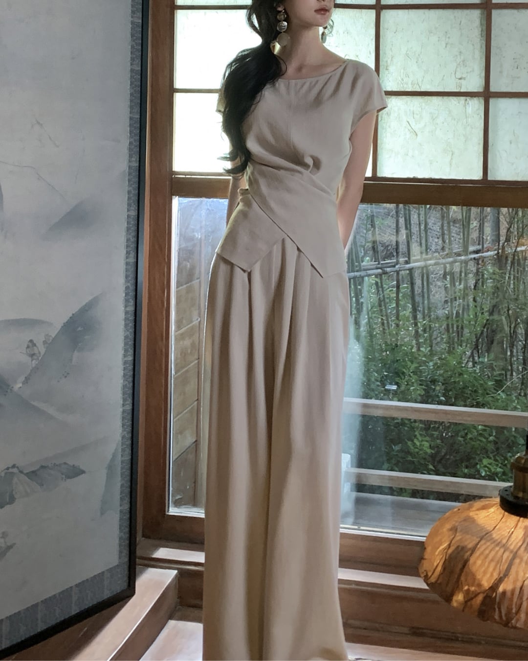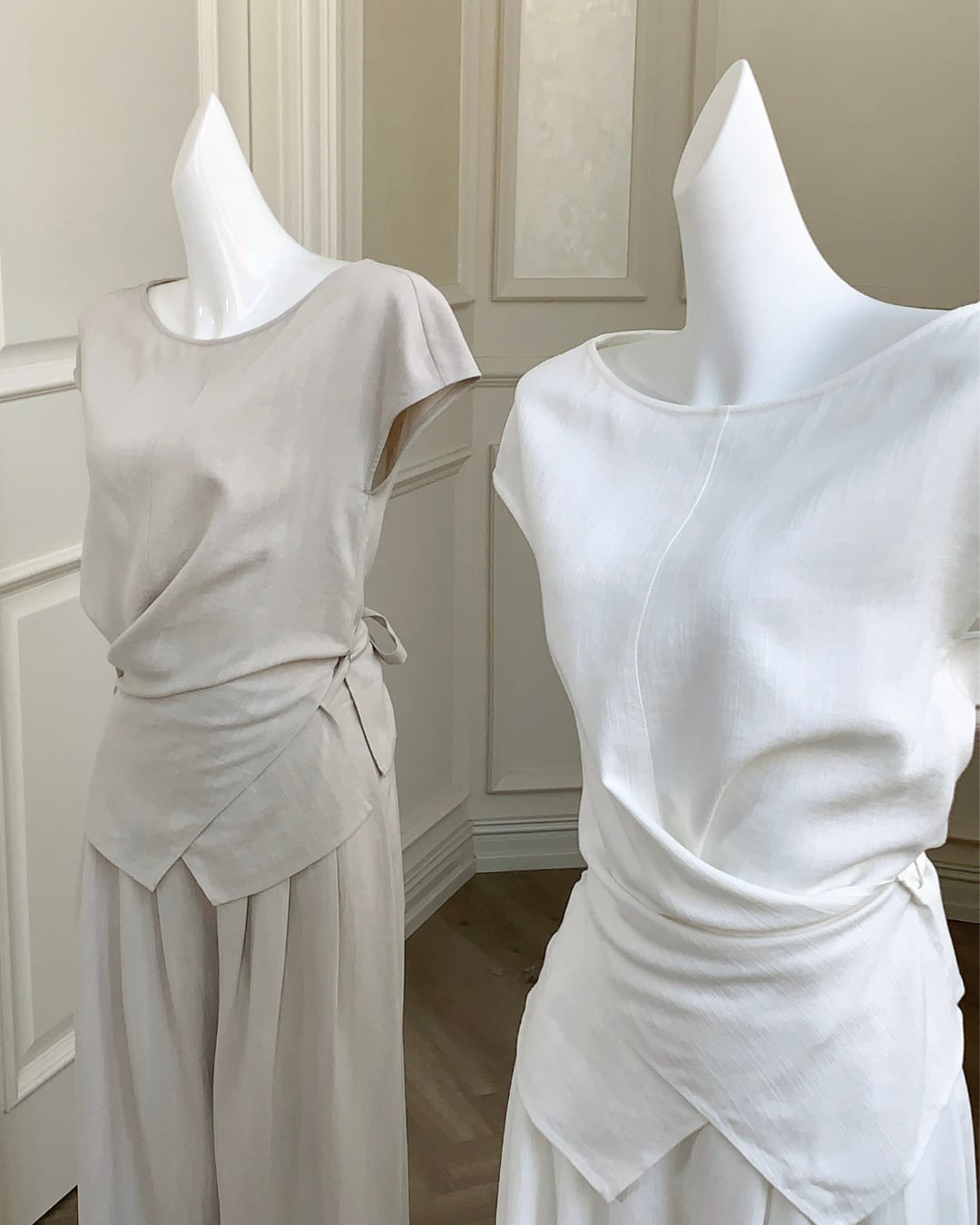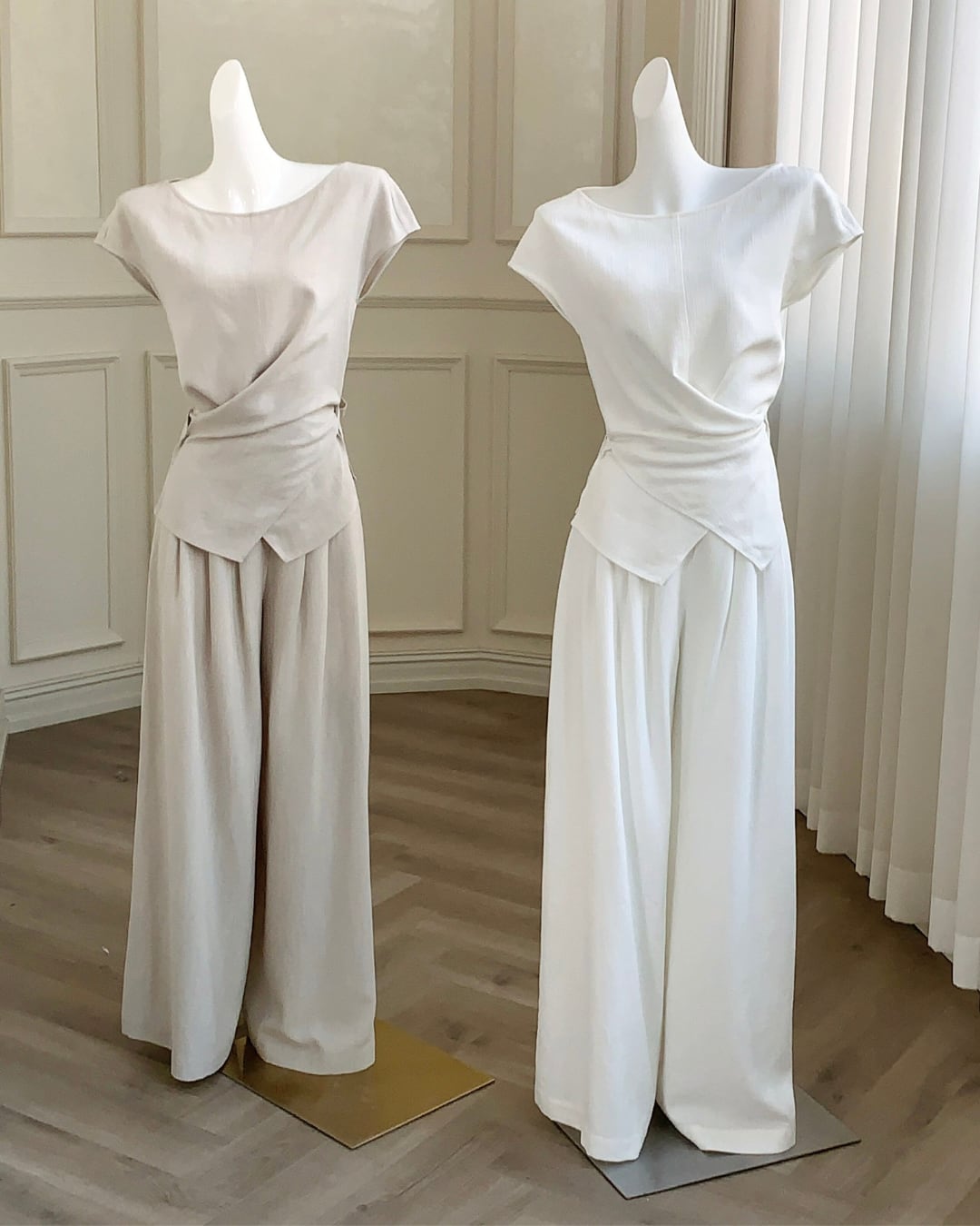ウエストのドレープデザインが美しいトップスとワイドパンツのセットアップ。トップスはウエストを包み込むようなクロスデザインで、自然な立体感を生みスタイルをすっきりと見せてくれます。パンツはゆったりとしたワイドシルエットで動くたびに柔らかく揺れ、上品でリラックス感のある大人のコーディネートを演出。セットでの着用はもちろん、それぞれ単体でも着回しやすくデイリーからお出かけまで活躍する一着です。
