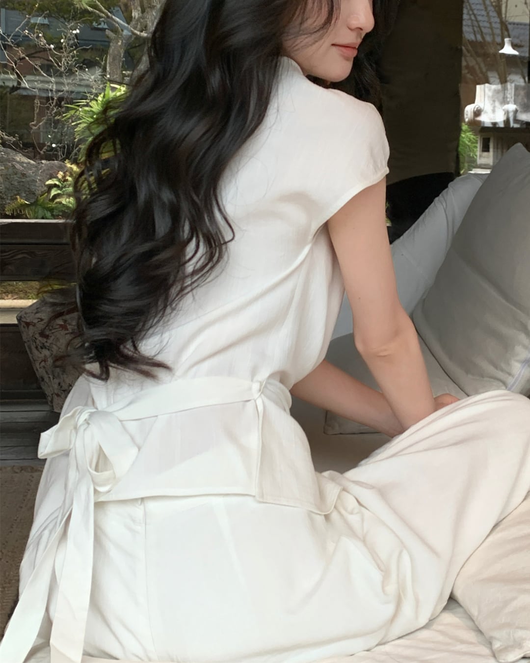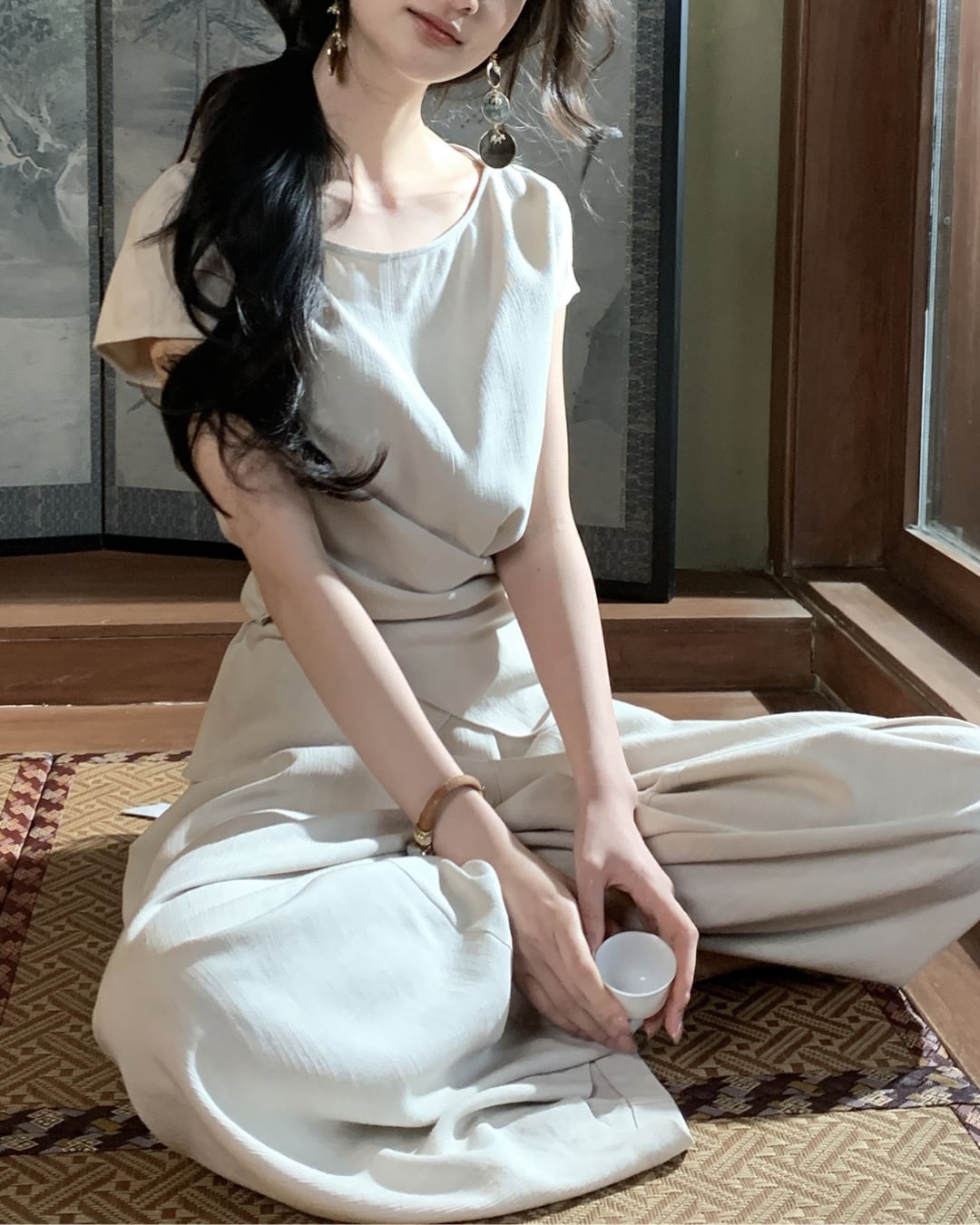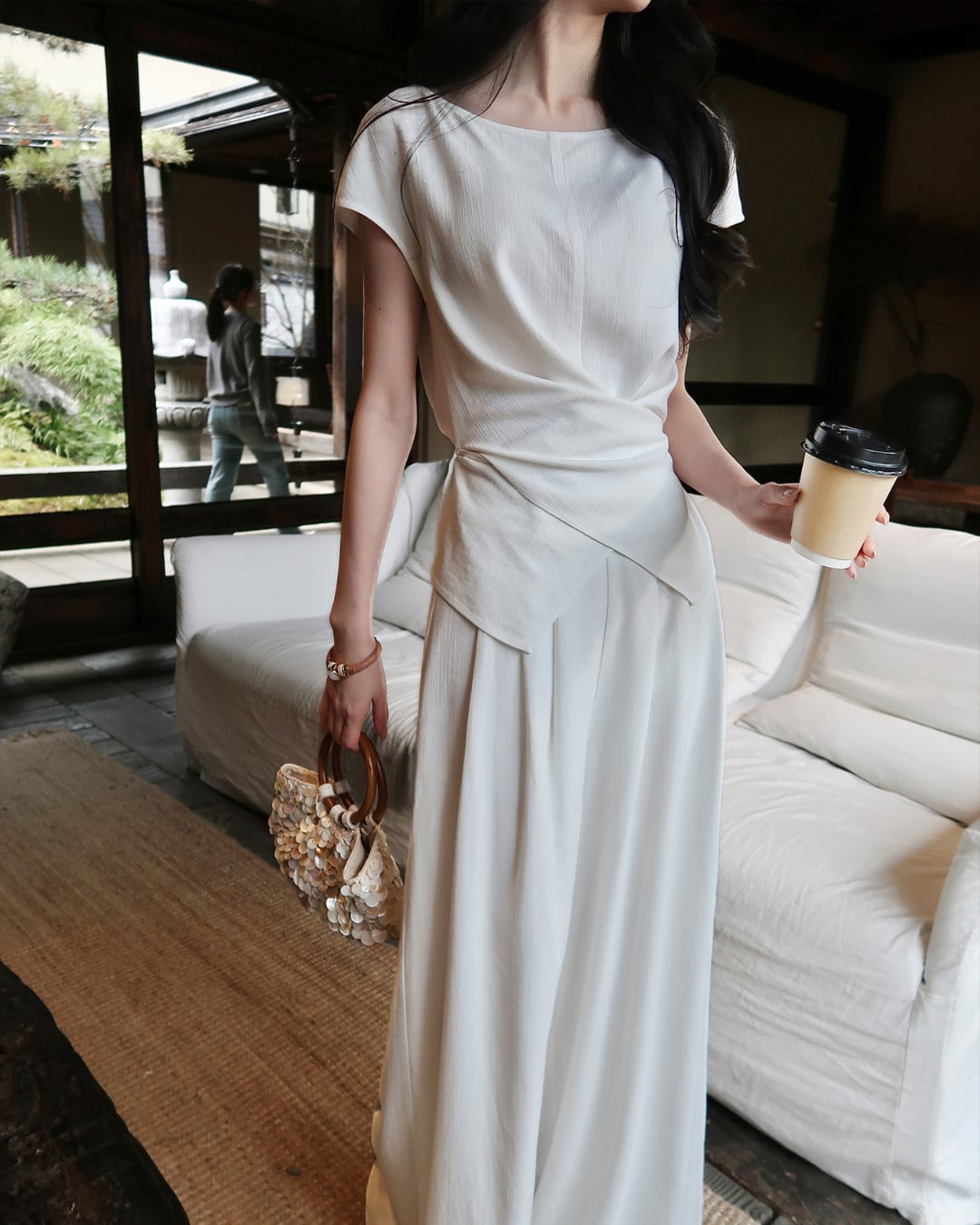 ウエストのドレープデザインが美しいトップスとワイドパンツのセットアップ。トップスはウエストを包み込むようなクロスデザインで、自然な立体感を生みスタイルをすっきりと見せてくれます。パンツはゆったりとしたワイドシルエットで動くたびに柔らかく揺れ、上品でリラックス感のある大人のコーディネートを演出。セットでの着用はもちろん、それぞれ単体でも着回しやすくデイリーからお出かけまで活躍する一着です。
