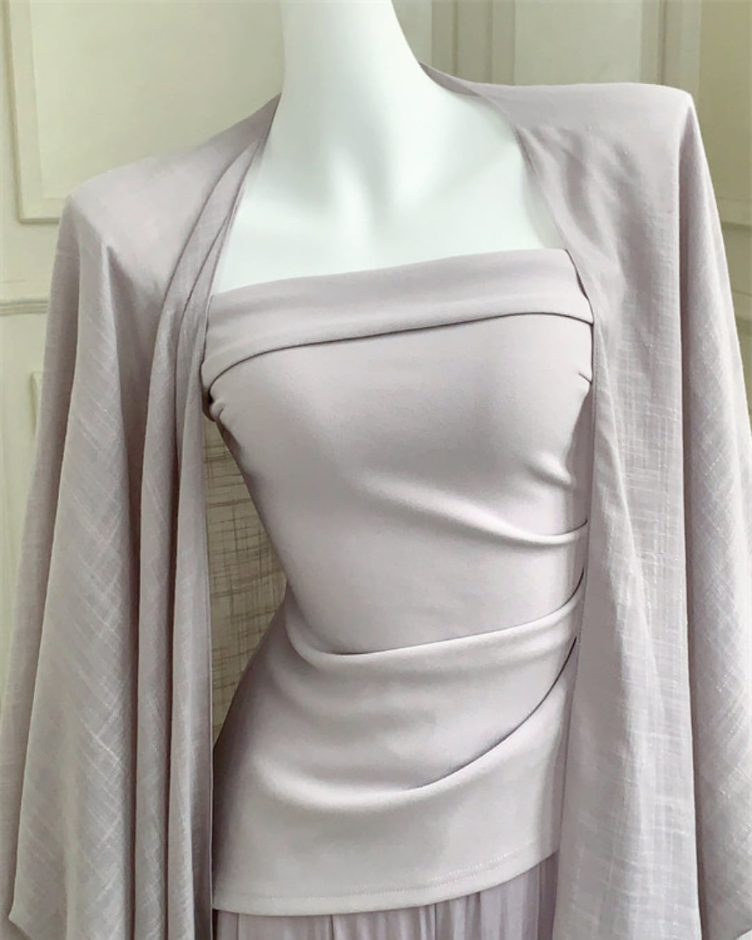 ベアトップ・ワイドパンツ・カーディガンの3点がセットになった上品なセットアップ。トップスは立体的なドレープデザインがウエストラインを美しく引き立て、女性らしいシルエットを演出します。パンツはたっぷりとしたワイドシルエットで動くたびに柔らかく揺れ、リラックス感のあるエレガントなスタイルに。軽やかなカーディガンを羽織ることで大人の抜け感あるコーディネートが完成。それぞれ単体でも着回しができる実用性の高い3点セットです。