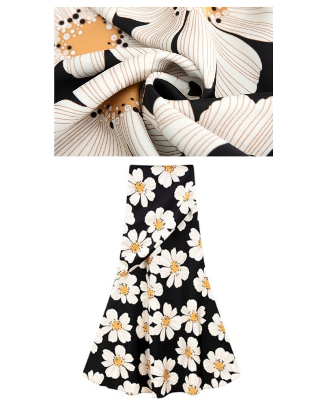 大胆なフラワープリントが目を惹く、華やかなロングスカート。 ブラックベースにホワイト×イエローの花柄が映え、コーディネートに上品な存在感をプラスします。高めのウエスト位置とすっきりとしたシルエットで、スタイルアップ効果も◎ 裾に向かって広がるマーメイドラインが女性らしい柔らかな動きを演出します。軽やかな素材感で歩くたびに美しく揺れ、リゾートスタイルからデイリーコーデまで幅広く活躍。 シンプルなトップスと合わせるだけでコーディネートが完成する主役スカートです。