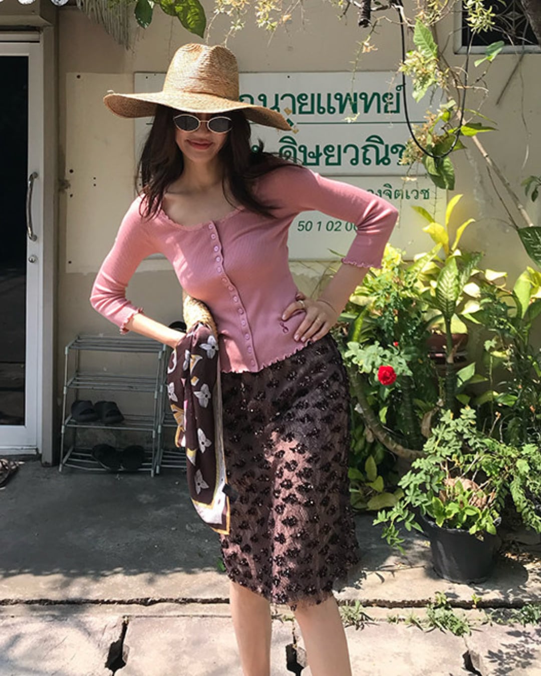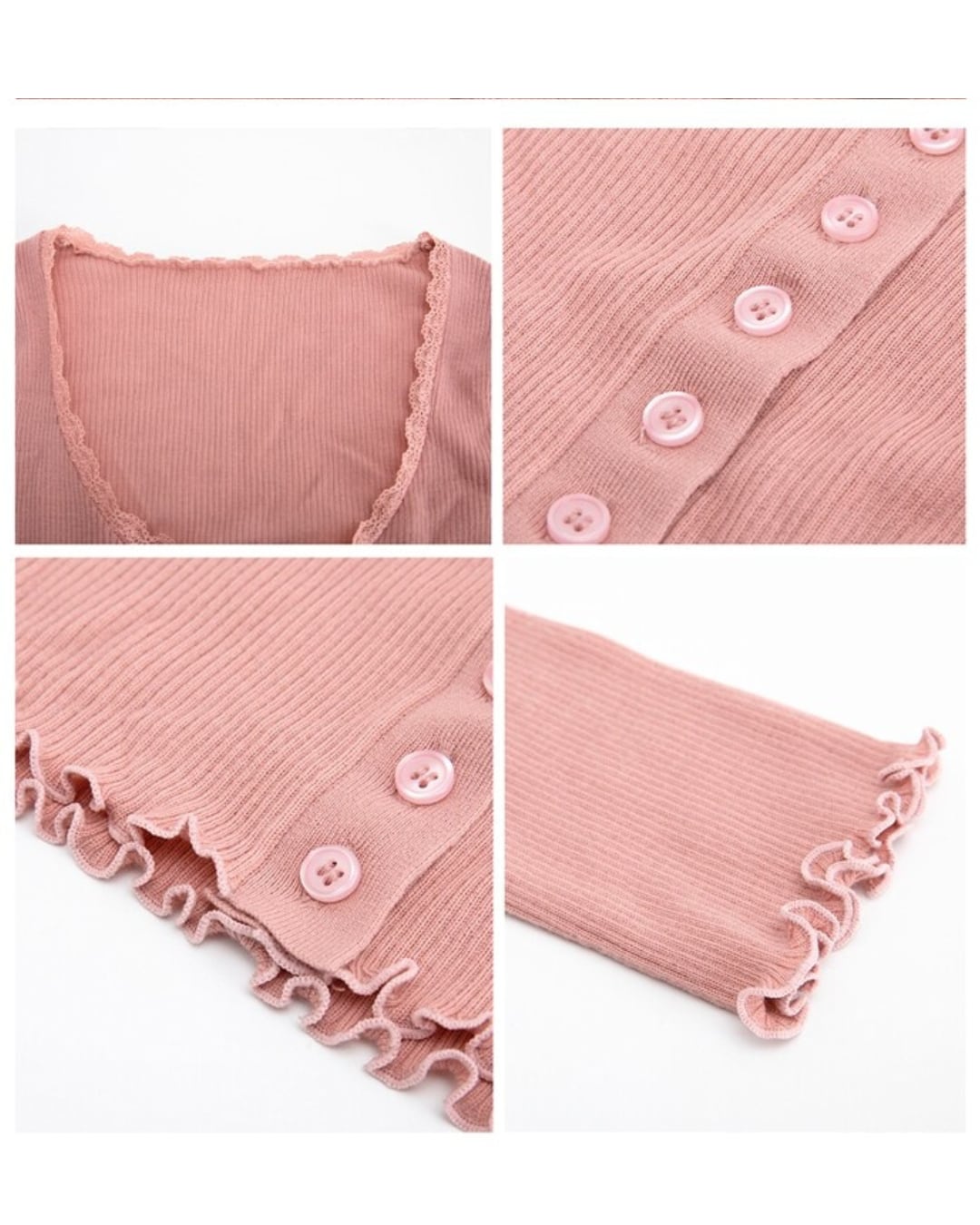 繊細なレースデザインが女性らしい印象を引き立てるリブニットカーディガン。 デコルテを綺麗に見せるネックラインと細身のシルエットが、上品で柔らかな雰囲気を演出します。程よく身体にフィットするリブ素材で、すっきりとしたシルエットを実現。 フロントのボタンデザインと裾・袖口のさりげないフリルディテールが、シンプルながらもフェミニンなアクセントに。スカートやデニムなど様々なボトムスと合わせやすく、デイリーコーデにも活躍する一着。 季節の変わり目にも取り入れやすい、上品で可愛らしいトップスです。