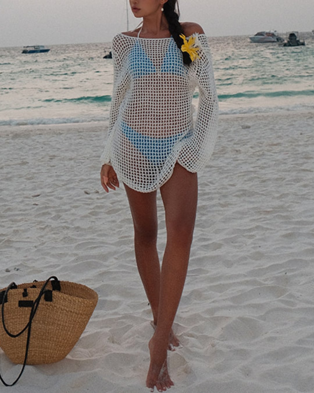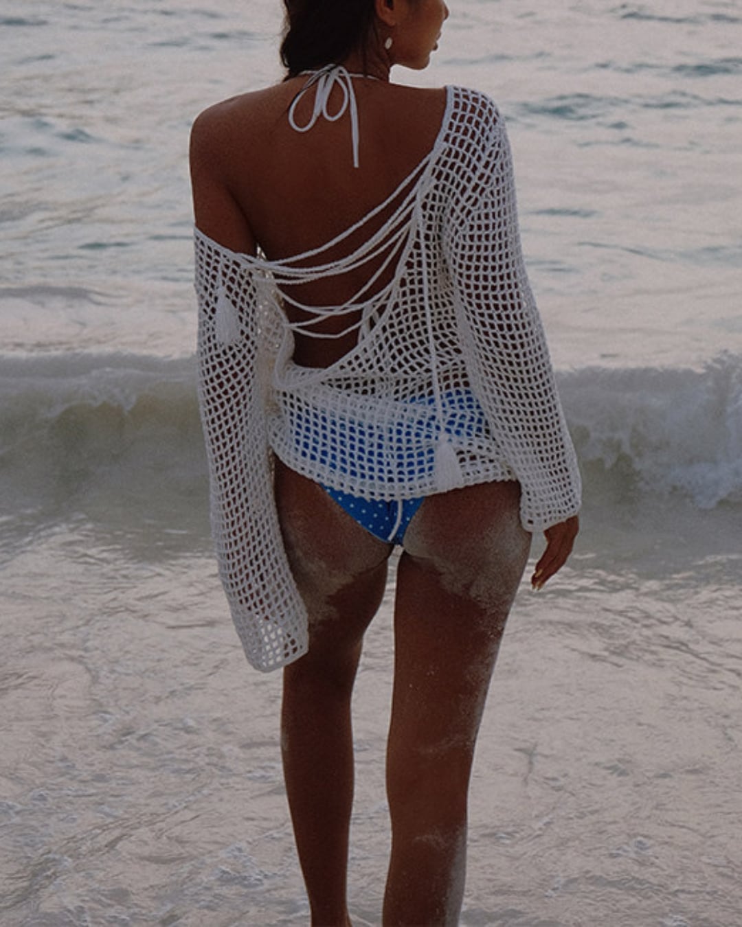 ざっくりとしたメッシュ編みが抜け感を演出するカバーアップトップス。程よい透け感で水着の上からさらっと羽織るだけで、リゾート感のあるスタイリングに。背中は大きく開いたバックオープンデザインにリボンディテールをプラスし、女性らしい後ろ姿を引き立てます。