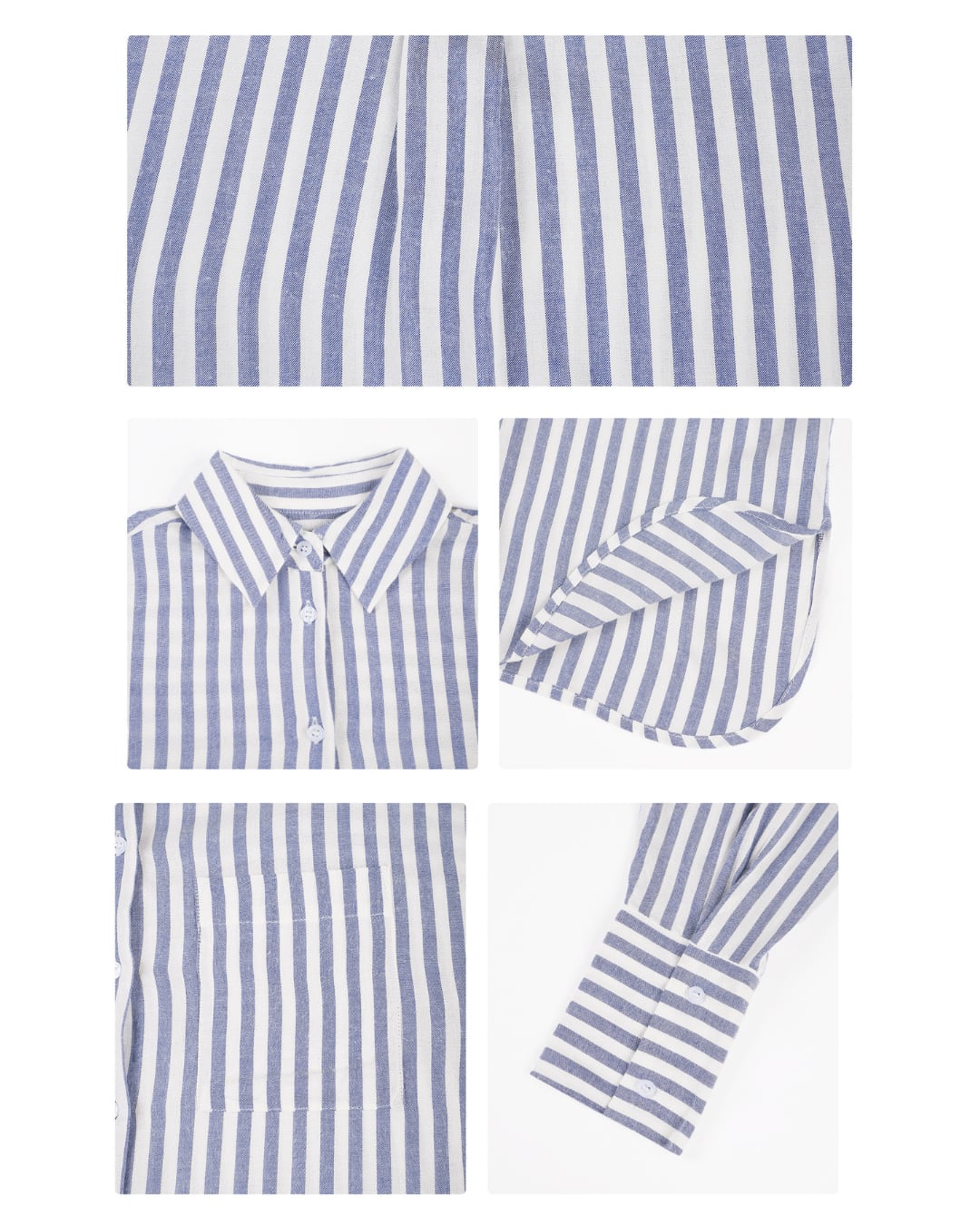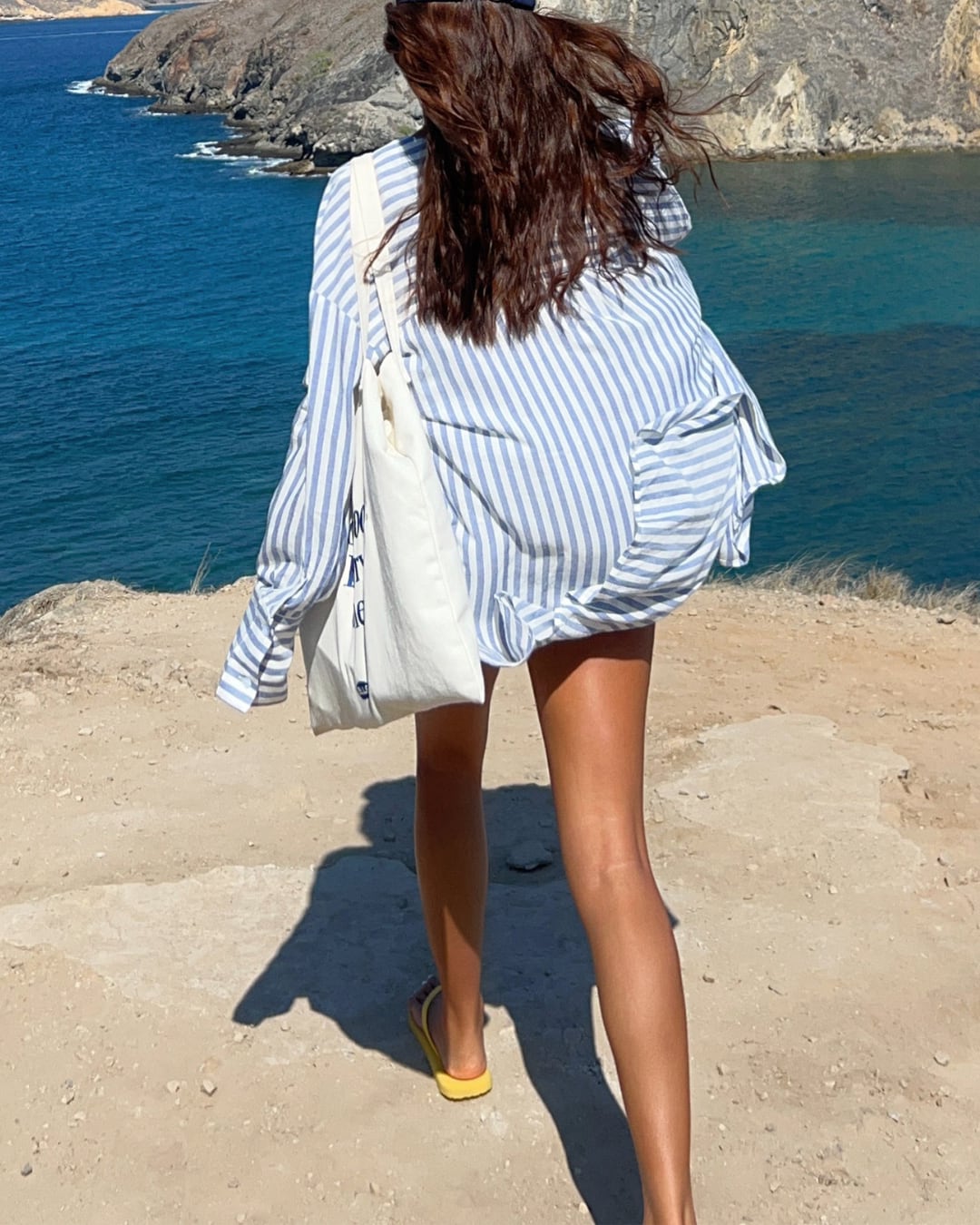 爽やかなブルーストライプが印象的なオーバーサイズシャツ。軽やかなコットン素材でさらっと羽織れる着心地が魅力。ゆったりとしたシルエットで水着の上からラフに着こなせ、リゾートやデイリーにも活躍する一枚です。
