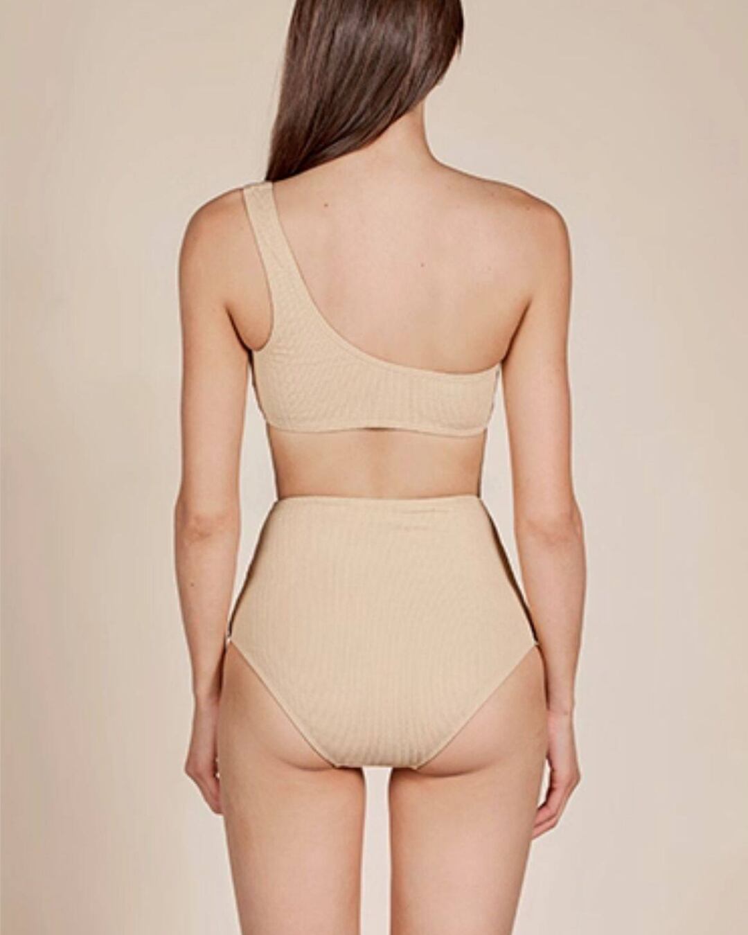 アシンメトリーなワンショルダーデザインが洗練された印象のビキニセット。ハイウエストボトムがウエストラインを美しく引き締め、スタイルアップ効果も◎シンプルながら立体感のある素材で、上品で大人なリゾートスタイルを演出します。