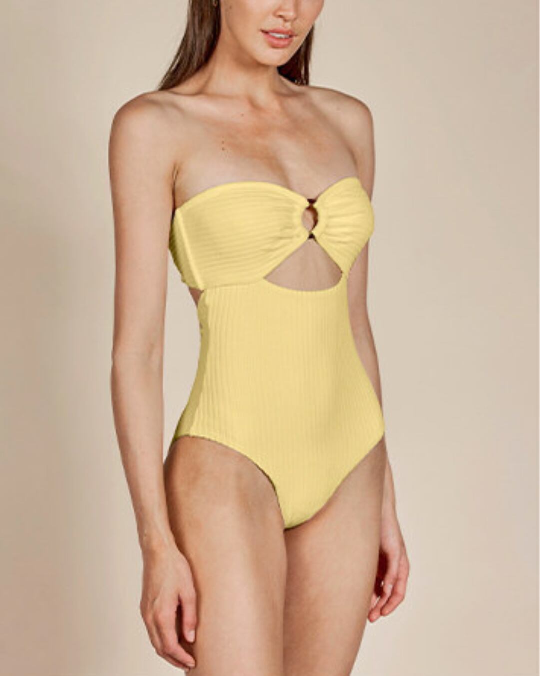 フロントのリングデザインとカットアウトが印象的なワンピース水着。立体感のあるリブ素材がボディラインを美しく引き立て、女性らしいシルエットを演出します。バックリボン仕様でフィット感の調整も可能。シンプルながらも華やかさのある一着です。